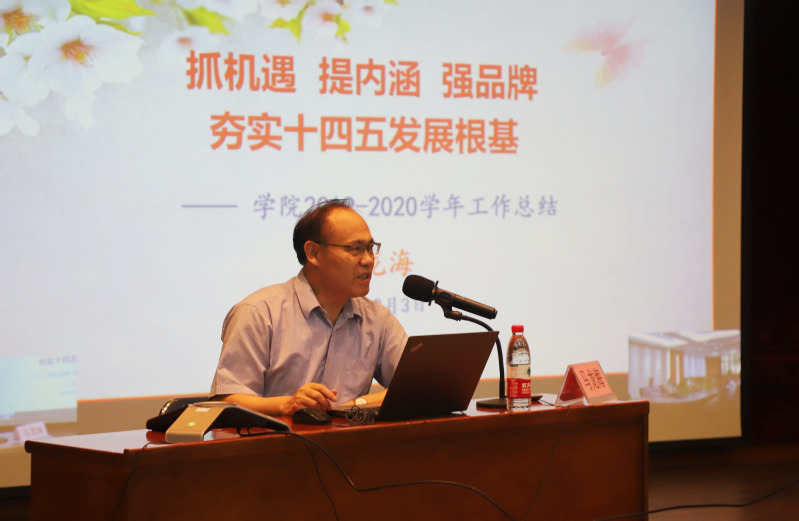 執(zhí)行校長(zhǎng)馬龍海代表行政班子進(jìn)行以《抓機(jī)遇、提內(nèi)涵、強(qiáng)品牌,夯實(shí)十四五發(fā)展根基》為主題的學(xué)年工作總結(jié)和下學(xué)年重點(diǎn)工作布置。指出,2019-2020學(xué)年,學(xué)校圍繞“不忘初心、華立再出發(fā)”主題,以國(guó)慶70周年慶典、黨內(nèi)主題教育活動(dòng)和華立20周年慶典活動(dòng)等為載體,以創(chuàng)新強(qiáng)校工程為抓手,以提升辦學(xué)質(zhì)量為核心,精心謀劃、真抓實(shí)干,在招生工作、省廳進(jìn)校資金、科研項(xiàng)目、獲批新專業(yè)數(shù)量等取得歷史性的突破。馬龍海執(zhí)行校長(zhǎng)分別從抗疫復(fù)學(xué)、黨建和立德樹人、師資實(shí)訓(xùn)、人才培養(yǎng)、教研科研、產(chǎn)教融合、招生就業(yè)、學(xué)生管理、行政后勤、國(guó)際交流、品牌建設(shè)和培訓(xùn)工作等12個(gè)方面對(duì)學(xué)院主要工作進(jìn)行全面總結(jié),強(qiáng)調(diào)學(xué)院在創(chuàng)新強(qiáng)校、內(nèi)涵建設(shè)和云浮校區(qū)建設(shè)三項(xiàng)重點(diǎn)工程卓有成效。