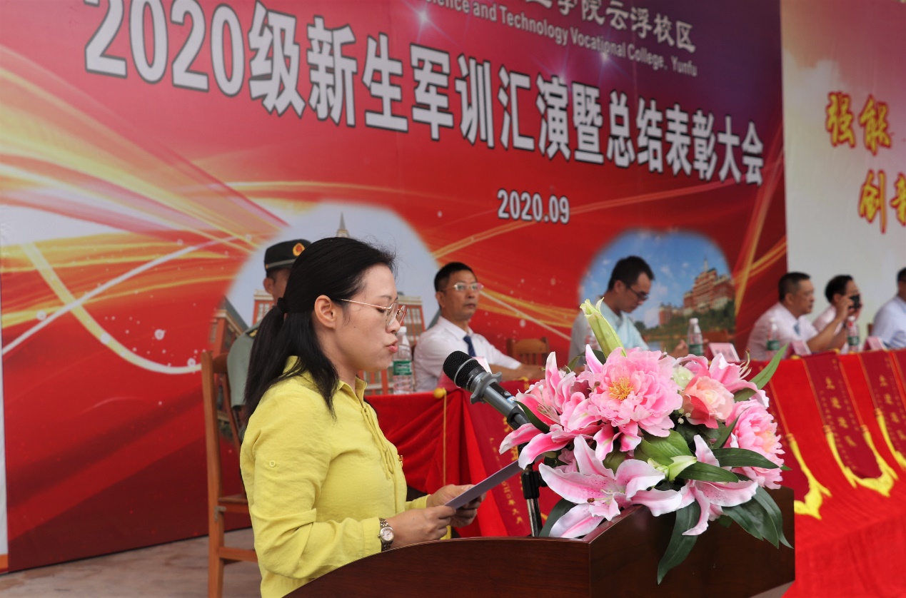校長助理王洪艷宣讀了云浮校區(qū)《關(guān)于表彰2020級新生軍訓(xùn)先進(jìn)集體和先進(jìn)個(gè)人的決定》。主席臺上的領(lǐng)導(dǎo)分別向受表彰的單位和個(gè)人頒發(fā)了錦旗和榮譽(yù)證書。