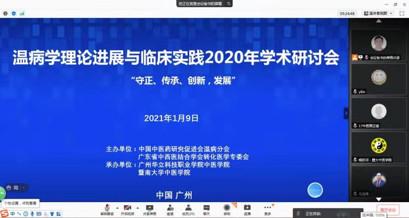 2021年1月9日由中國中醫(yī)藥研究促進會溫病分會、廣東省中西醫(yī)結合學會轉化醫(yī)學專業(yè)委員會主辦,廣州華立科技職業(yè)學院中醫(yī)藥學院、暨南大學中醫(yī)學院共同承辦的以“傳承、守正、創(chuàng)新、發(fā)展”為主題的全國溫病學理論進展與臨床實踐學術交流大會以騰訊會議的形式在線圓滿舉行。開幕式由我校中醫(yī)藥學院院長楊欽河教授主持。