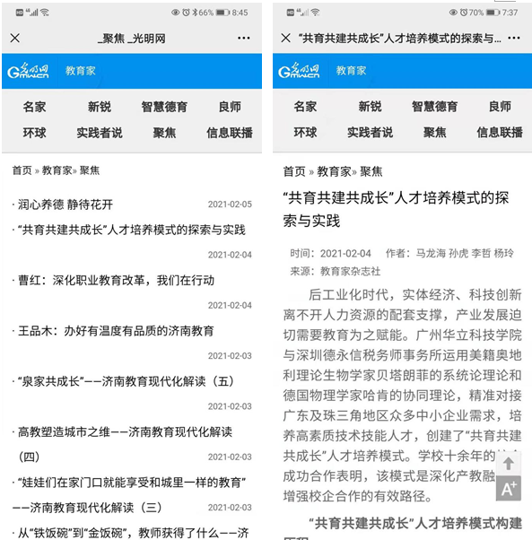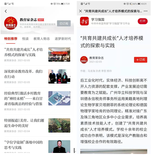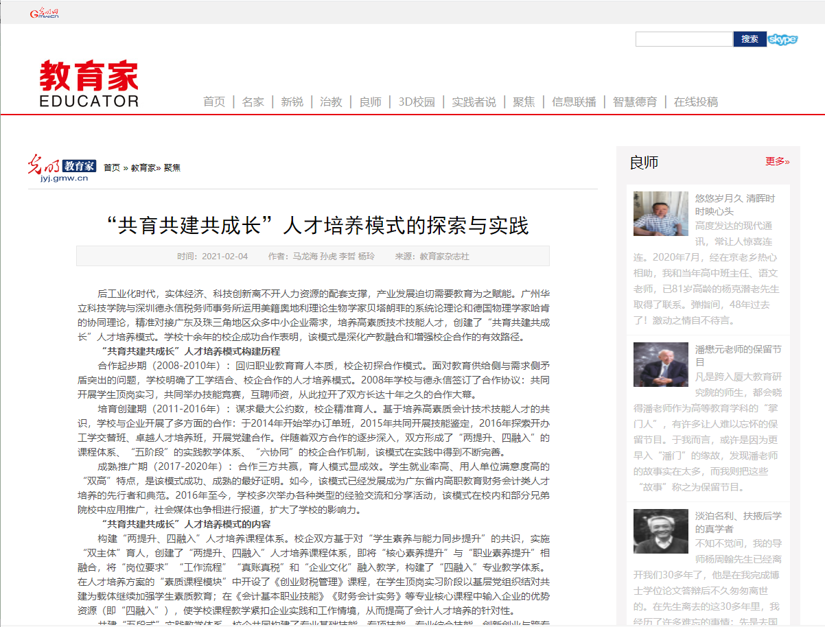 近日,我校會(huì)計(jì)專(zhuān)業(yè)《“共育共建共成長(zhǎng)”人才培養(yǎng)模式的探索與實(shí)踐》成功在《教育家》雜志發(fā)表,不僅如此,該文還登上了光明網(wǎng)和“學(xué)習(xí)強(qiáng)國(guó)”APP?!督逃摇冯s志由光明日?qǐng)?bào)主管,是中共中央黨報(bào)主管的教育主流媒體,其依托《光明日?qǐng)?bào)》在知識(shí)界、文化界、教育界、理論界的權(quán)威影響力,致力于打造深度與廣度并重、專(zhuān)業(yè)與內(nèi)涵并包的高端期刊。
