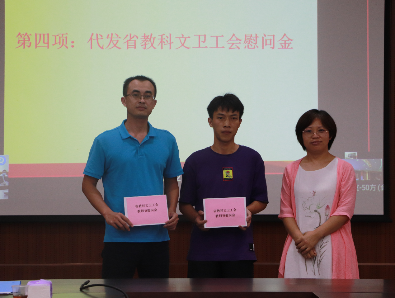 在今天隆重又簡樸的日子,省教科文衛(wèi)工會慰問我校困難教師,由學(xué)校代發(fā)慰問金。
