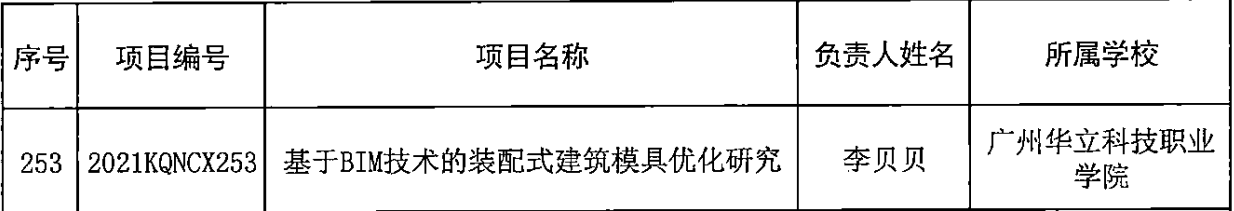 根據(jù)《廣東省教育廳關(guān)于開(kāi)展2021年度廣東高??蒲衅脚_(tái)和科研項(xiàng)目申報(bào)工作的通知》,經(jīng)學(xué)校推薦、省教育廳組織專家評(píng)審,我校馬俊副校長(zhǎng)《基于立德樹(shù)人的高?!叭恕迸囵B(yǎng)路徑研究》等3項(xiàng)課題獲特色創(chuàng)新類立項(xiàng),李貝貝《基于BIM技術(shù)的裝配式建筑模具優(yōu)化研究》等3項(xiàng)課題獲青年創(chuàng)新類立項(xiàng),希望課題負(fù)責(zé)人能夠按照教育廳要求,認(rèn)真完成課題相關(guān)要求。