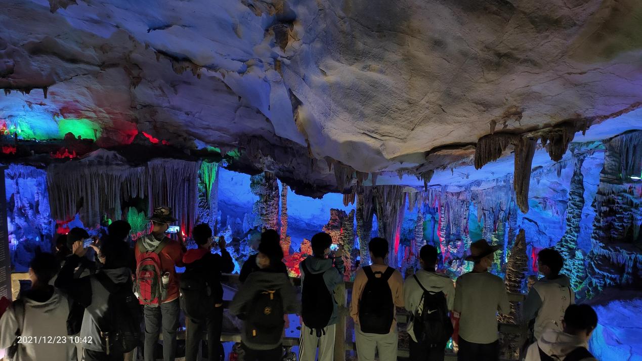 (學(xué)生在溶洞中觀察石鐘乳、石筍、石柱等巖溶地貌)