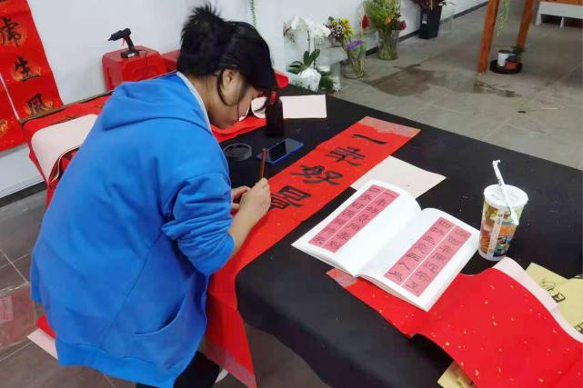 同學正在專心致志地寫春聯(lián)