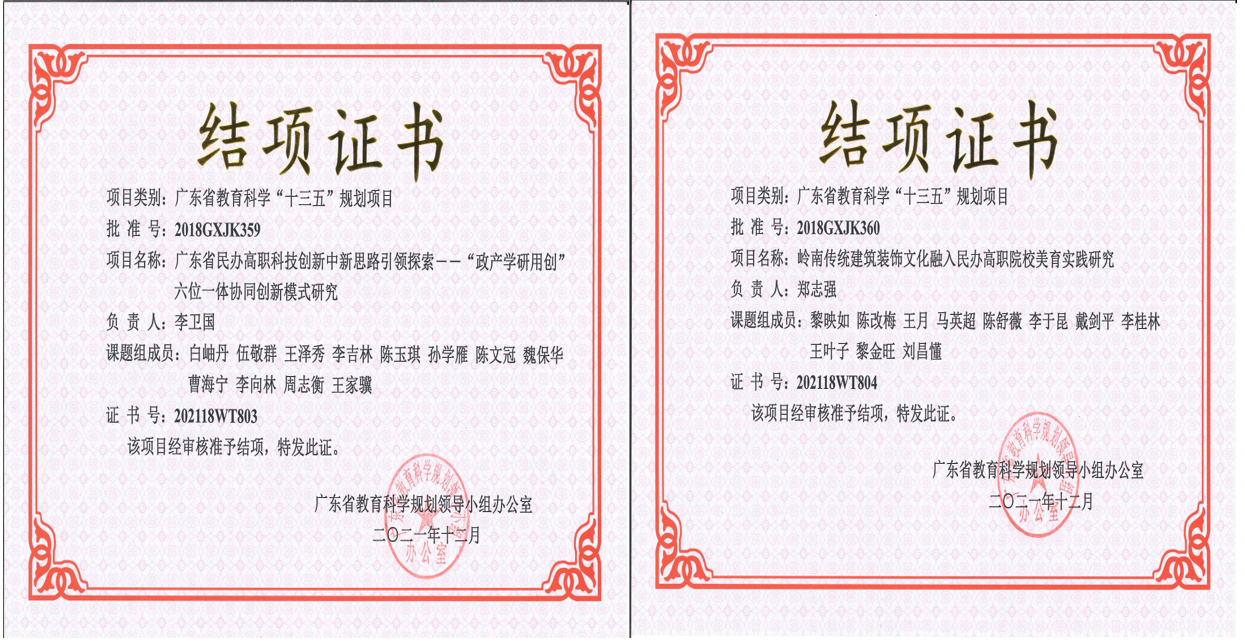 根據(jù)根據(jù)省教育廳、省財政廳制定的《廣東省高等教育“創(chuàng)新強(qiáng)校工程”實(shí)施方案(試行)》(粵教高函〔2014]8號)的要求,結(jié)合“廣東高校重大科研項(xiàng)目與成果培育計劃”結(jié)題要求,我校分別對周志衡老師等老師主持的廣東省教育廳普通高??蒲泻晚?xiàng)目結(jié)題相關(guān)規(guī)定,李衛(wèi)國、鄭志強(qiáng)老師主持的廣東省教育科學(xué)規(guī)劃項(xiàng)目相關(guān)結(jié)題規(guī)定,對申請結(jié)題的項(xiàng)目開展結(jié)題相關(guān)工作,并按時提交結(jié)題材料,經(jīng)過專家評審,全部課題通過驗(yàn)收,特此祝賀。