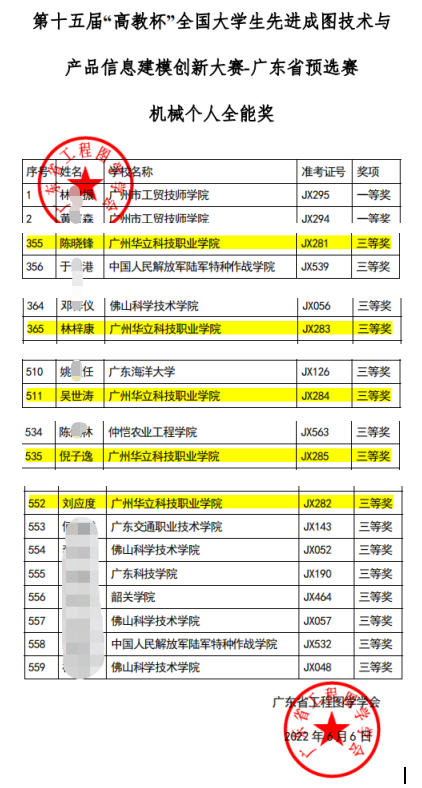 近日,第十五屆“高教杯”全國大學(xué)生先進成圖技術(shù)與產(chǎn)品信息建模創(chuàng)新大賽-廣東省預(yù)選賽場上傳來捷報,由我校馬洪德、許愛斌、吳寶君、陳立峰四位老師指導(dǎo)的陳曉鋒、林梓康、吳世濤、倪子逸、劉應(yīng)度5位機電學(xué)子從全省700多名參賽選手中脫穎而出,均斬獲大賽“機械個人全能獎”三等獎!我校榮獲大賽 “機械團體獎”三等獎,并獲得參加國賽資格,實現(xiàn)我校該項賽事歷史性突破!我校也是此次大賽中榮獲團體獎和獲得國賽資格的唯一民辦高職院校。
