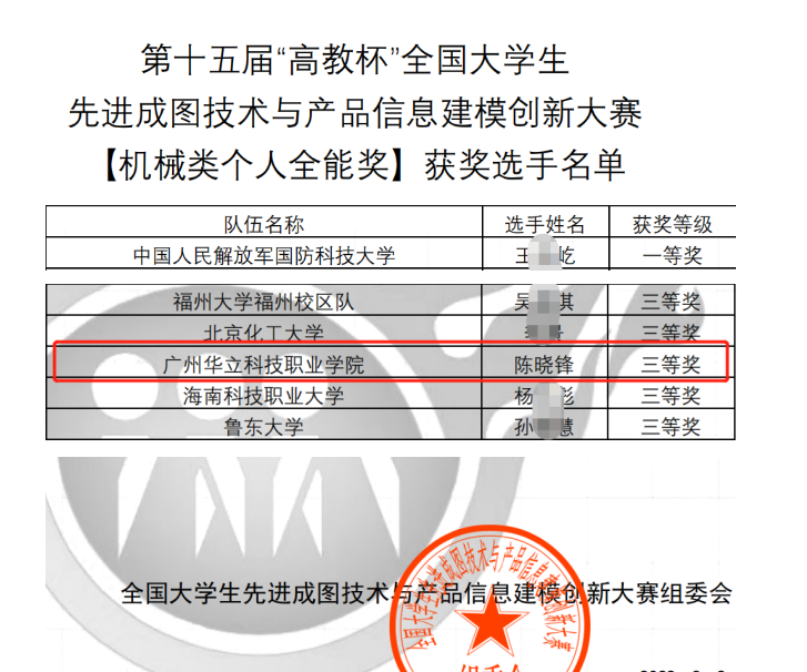 今年5月份,我校陳曉鋒、林梓康、吳世濤、倪子逸、劉應度五位學子組成的競賽團隊參加了廣東省預選賽,均獲省賽個人三等獎,廣州華立科技職業(yè)學院榮獲省賽團體獎三等獎,成為大賽榮獲團體獎的唯一民辦高職院校。陳曉鋒、吳世濤兩位同學獲得參加國賽資格。最終,陳曉鋒同學憑借出色的發(fā)揮,榮獲國賽機械類個人全能獎三等獎,實現(xiàn)我校在該項國賽上的歷史性突破!