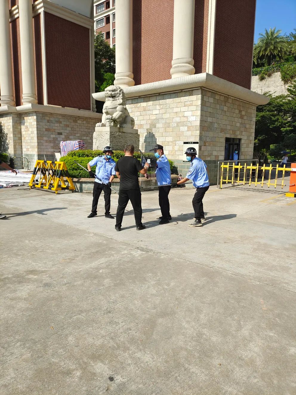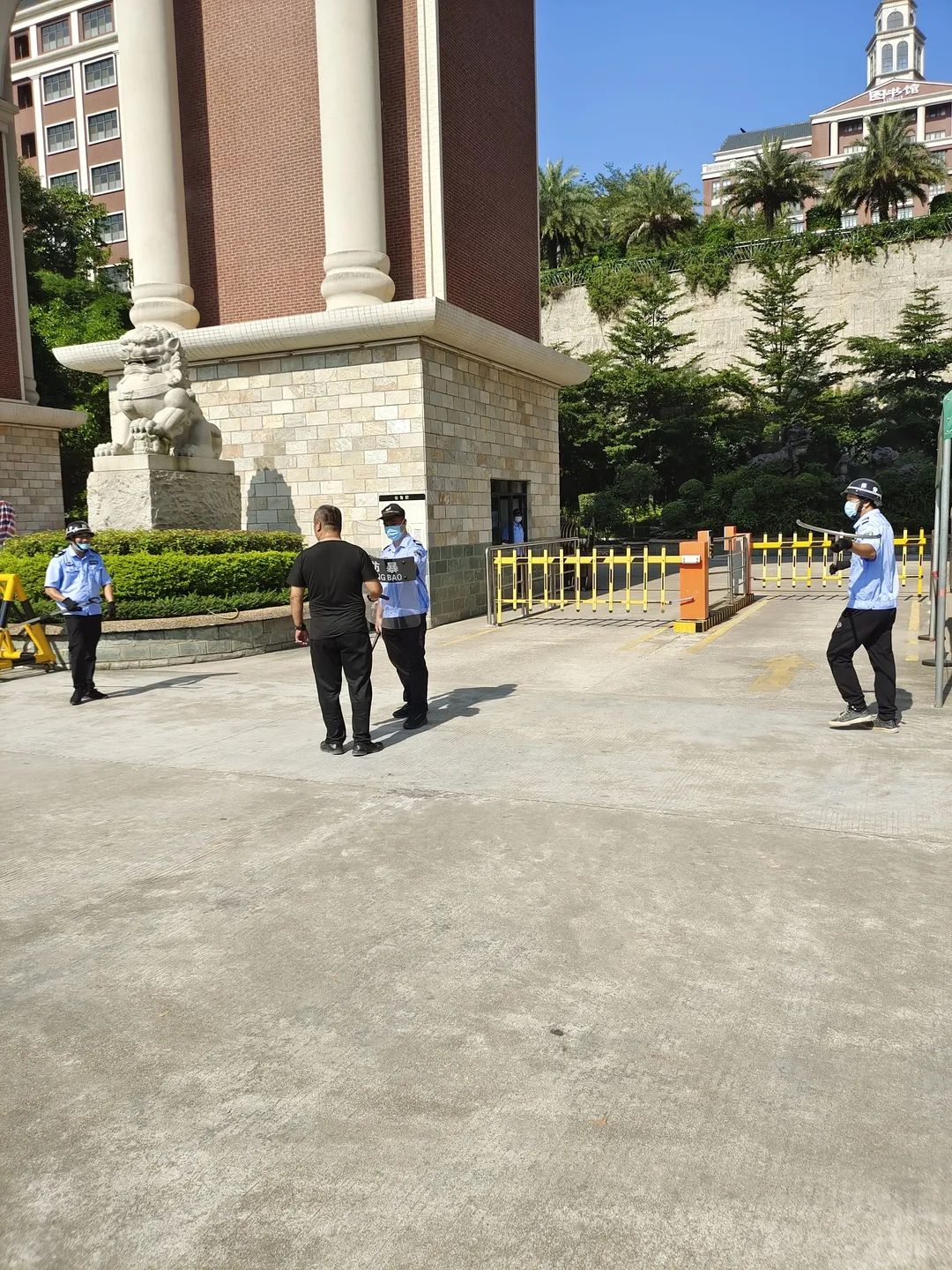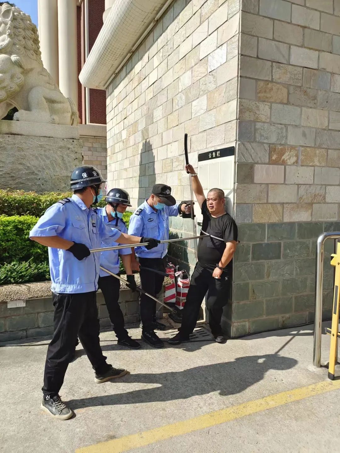 8月23日上午9時(shí),一名扮演“歹徒”的工作人員試圖闖入校園,對師生安全造成了威脅。校園安保人員發(fā)現(xiàn)“歹徒”硬闖校園,一名安保馬上一鍵報(bào)警,并立刻打電話給校領(lǐng)導(dǎo)派人到現(xiàn)場協(xié)助安保人員將其制服,然后馬上回到站位,與另外兩名安保一同抵御。安保人員手持腳叉、鋼叉、防暴盾等防暴工具,把“歹徒”壓制到角落或者地上,奪取兇徒武器交由于警方、保護(hù)現(xiàn)場,并立刻回到崗位,做好上報(bào)指示。