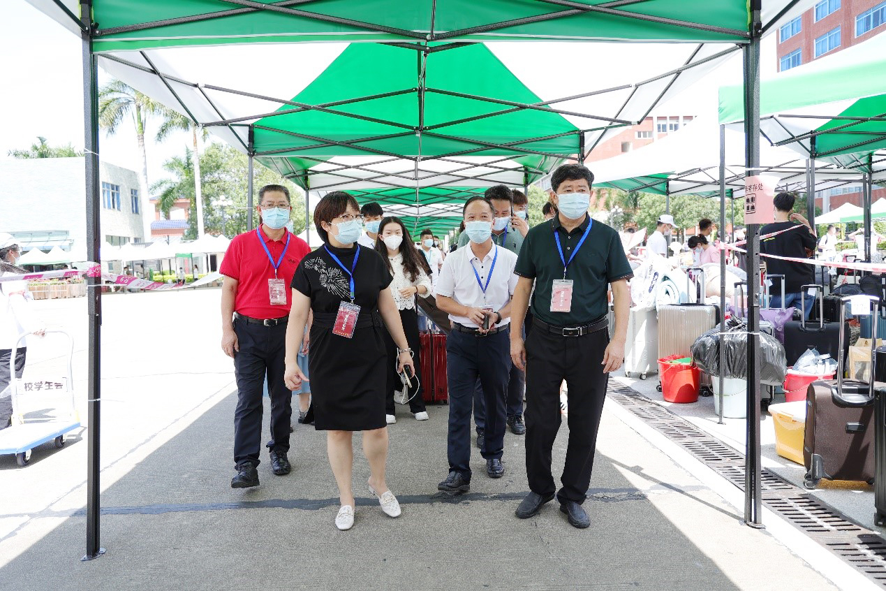 迎新當(dāng)天,學(xué)校領(lǐng)導(dǎo)率隊檢查迎新工作,關(guān)心了解新生的入校報到情況,耐心解答家長對疫情防控和校園管理的提問,并慰問迎新工作人員和師生志愿者。