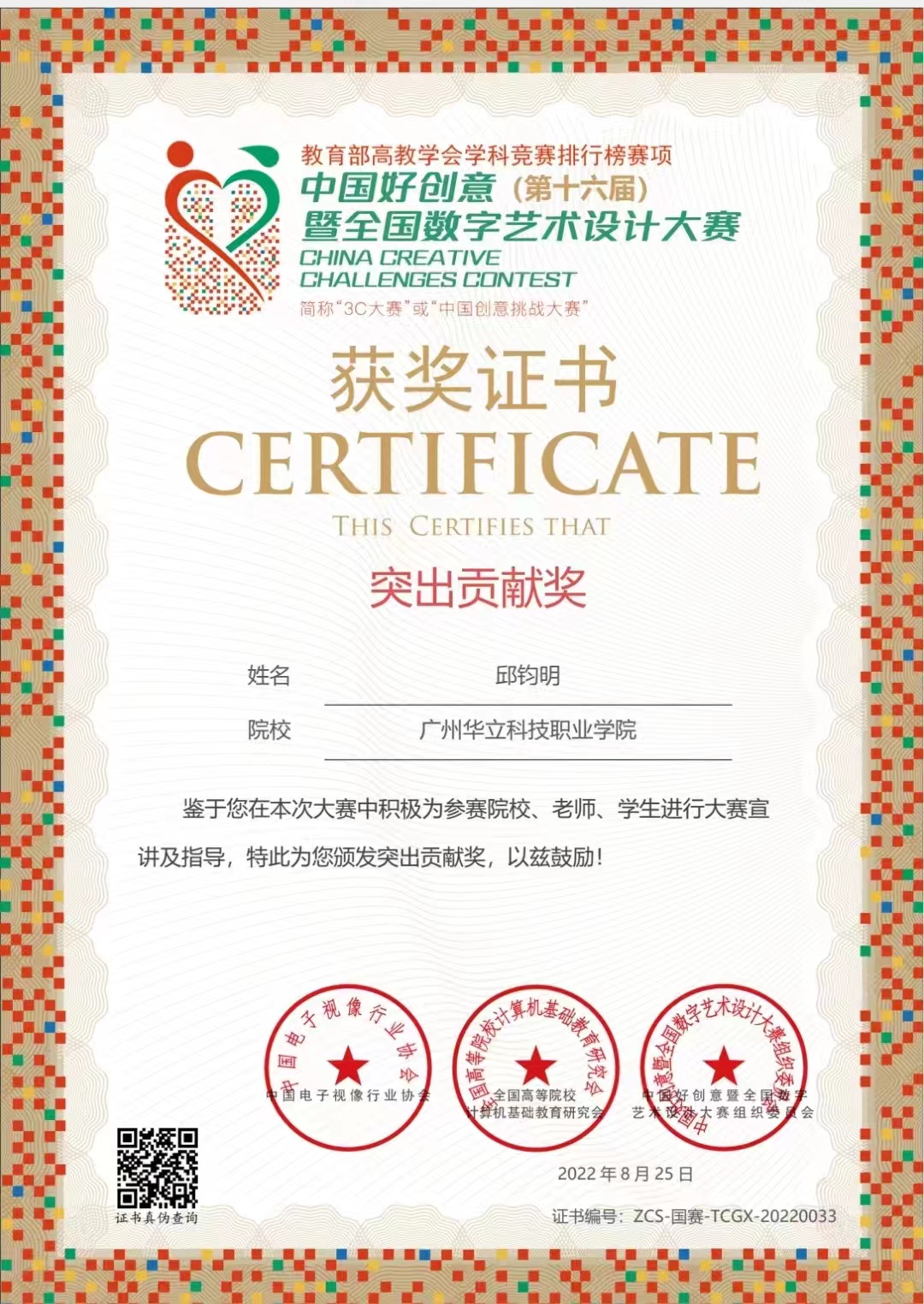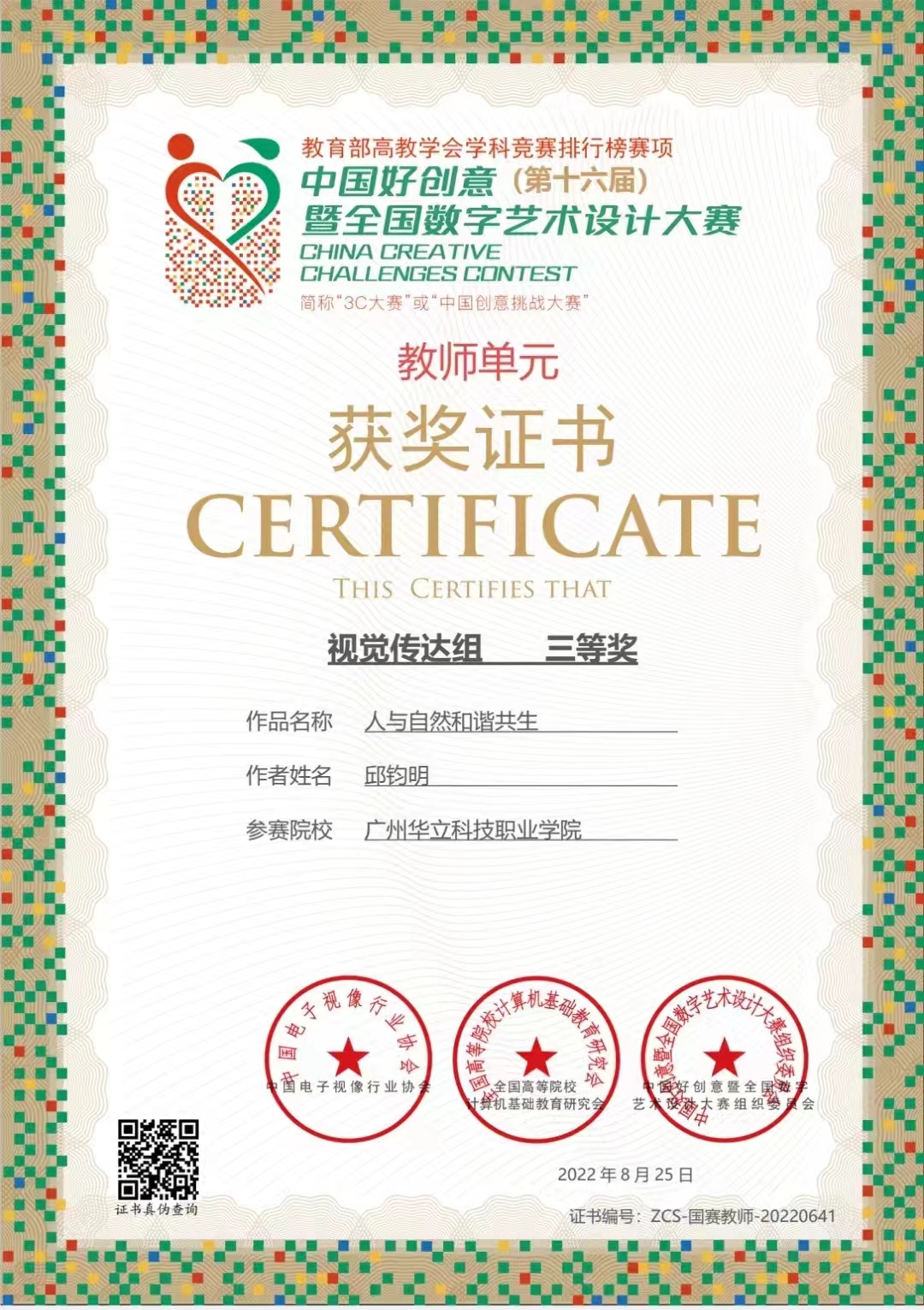 科研項(xiàng)目結(jié)碩果,國賽也傳來捷報(bào)。第16屆中國好創(chuàng)意暨全國數(shù)字藝術(shù)設(shè)計(jì)大賽上,教育學(xué)院邱鈞明老師的作品“人與自然和諧共生”獲得了國賽單元視覺傳達(dá)組三等獎和個(gè)人突出貢獻(xiàn)獎!