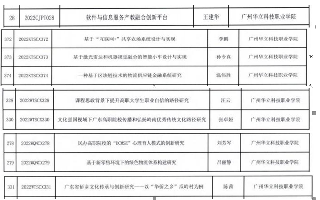 近日,廣東省教育廳公布了2022年度普通高校重點科研平臺和項目立項(含認(rèn)定類)名單,我校共9個項目獲批立項。其中,2022年度普通高校重點科研平臺1個:《軟件與信息服務(wù)產(chǎn)教融合創(chuàng)新平臺》(負(fù)責(zé)人:王建華)。2022年度廣東高??蒲衅脚_和項目8個。特色創(chuàng)新項目(自然科學(xué))3個;特色創(chuàng)新類項目(哲學(xué)社會科學(xué))3個;青年創(chuàng)新人才項目2個。具體立項情況見下表截圖。