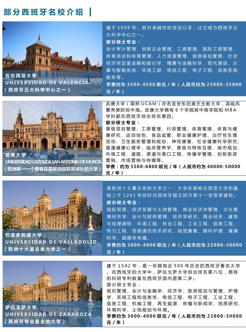 (2)最后一年在西班牙相關大學學習,向廣州華立科技職業(yè)學院繳納學費:12000元/年,同時向西班牙相關大學繳納學費:2-5萬/年(優(yōu)秀學生可獲獎學金;如北安普頓大學學費調整,則以其公布的為準)。