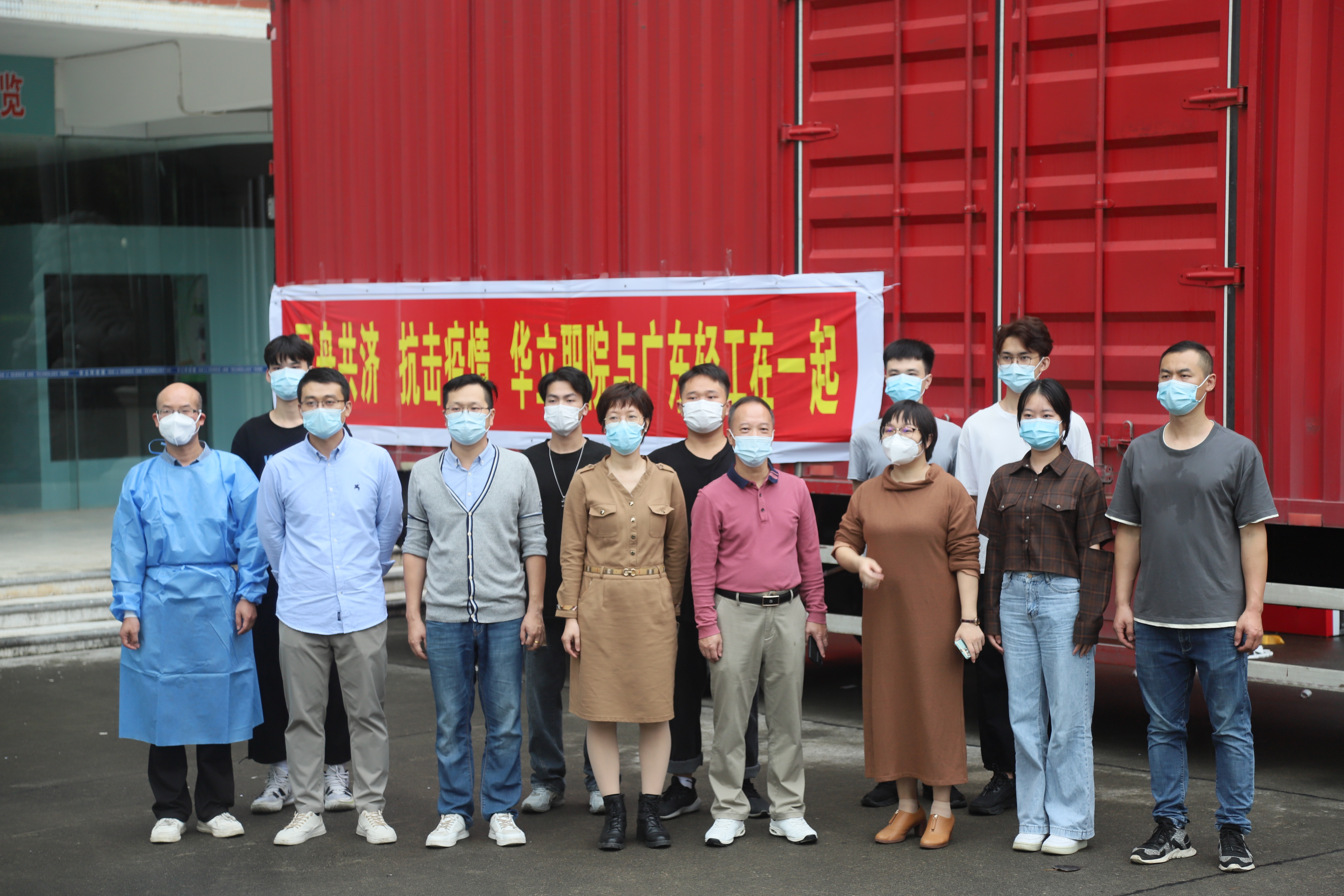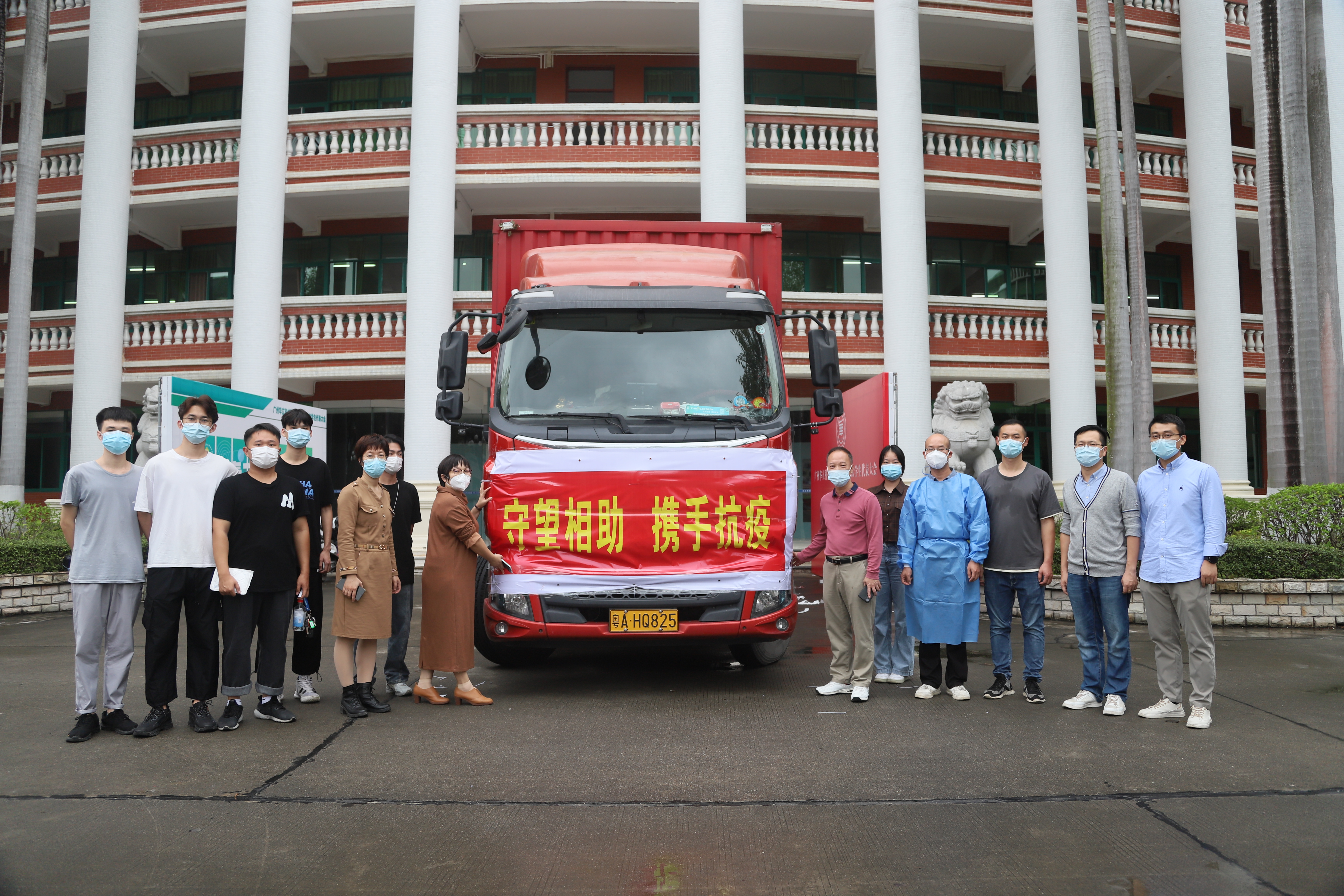 11月22日下午,一輛大型貨運(yùn)車在華立職院廣州校區(qū)圖書(shū)館前整裝待發(fā),車身上“守望相助 攜手抗疫”“同舟共濟(jì) 抗擊疫情 華立職院與廣東輕工在一起”的橫幅格外醒目。