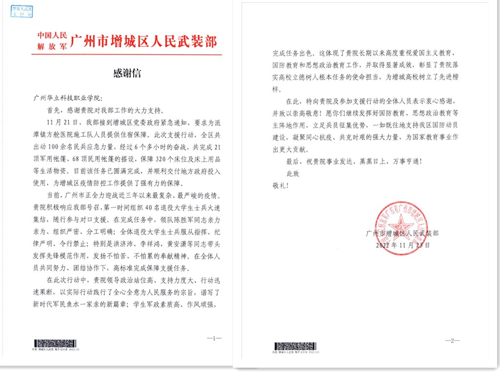 11月23日,我校收到增城區(qū)武裝部的感謝信,感謝我校武裝部帶領(lǐng)廣大退役大學(xué)生士兵參加抗疫工作。