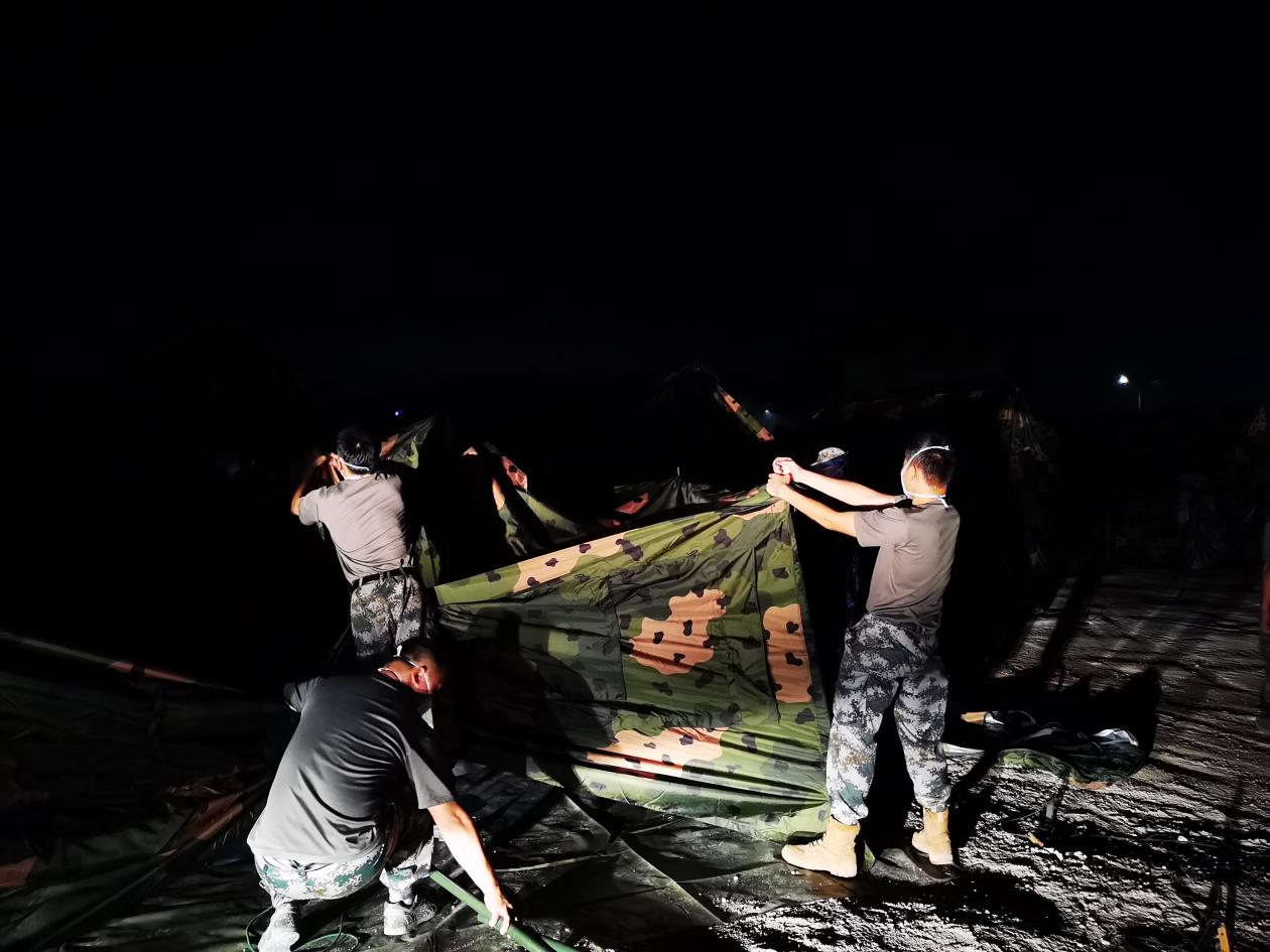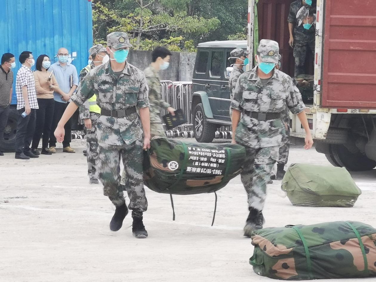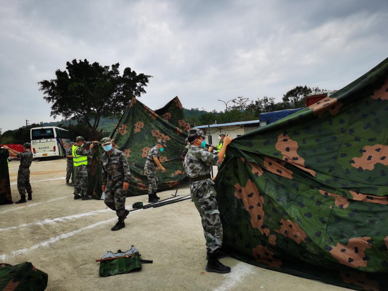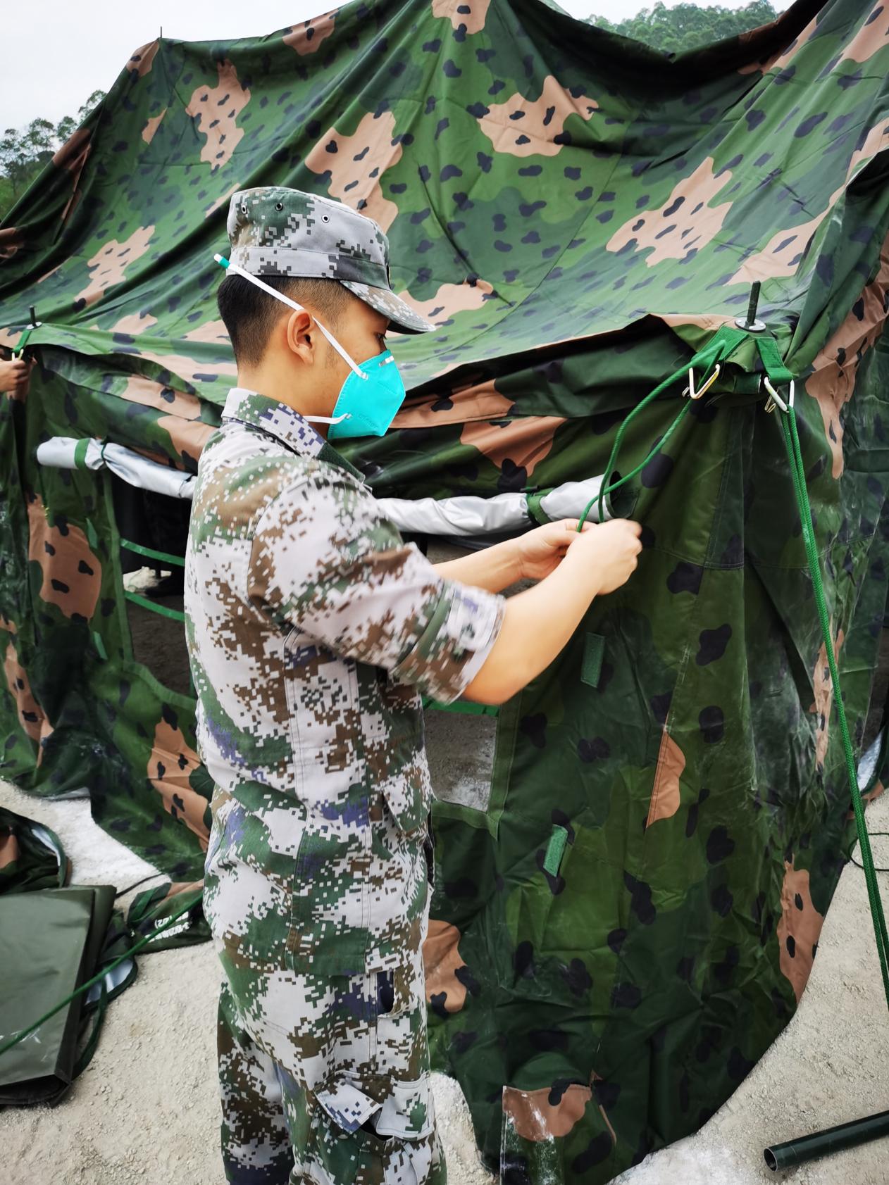 在全體人員的共同努力、團(tuán)結(jié)協(xié)作下,經(jīng)過6個(gè)多小時(shí)的奮戰(zhàn),高標(biāo)準(zhǔn)完成此次保障支援任務(wù),共完成了21頂軍用帳篷、68頂民用帳篷的搭設(shè),保障了320個(gè)床位和床上用品等生活物資,順利交付政府投入使用,為增城區(qū)疫情防控工作提供了強(qiáng)有力的保障。支援行動(dòng)結(jié)束后,我校收到中國人民解放軍廣州市增城區(qū)人民武裝部發(fā)來的感謝信,特別感謝我院對(duì)此次工作的大力支持,并高度贊賞領(lǐng)隊(duì)陳勝軍同志的嚴(yán)密組織工作,同時(shí)表揚(yáng)我院退役學(xué)生的積極配合并出色完成工作任務(wù),特別是洪濟(jì)沛、李祥鴻、黃安瀟等同學(xué)的奉獻(xiàn)精神。