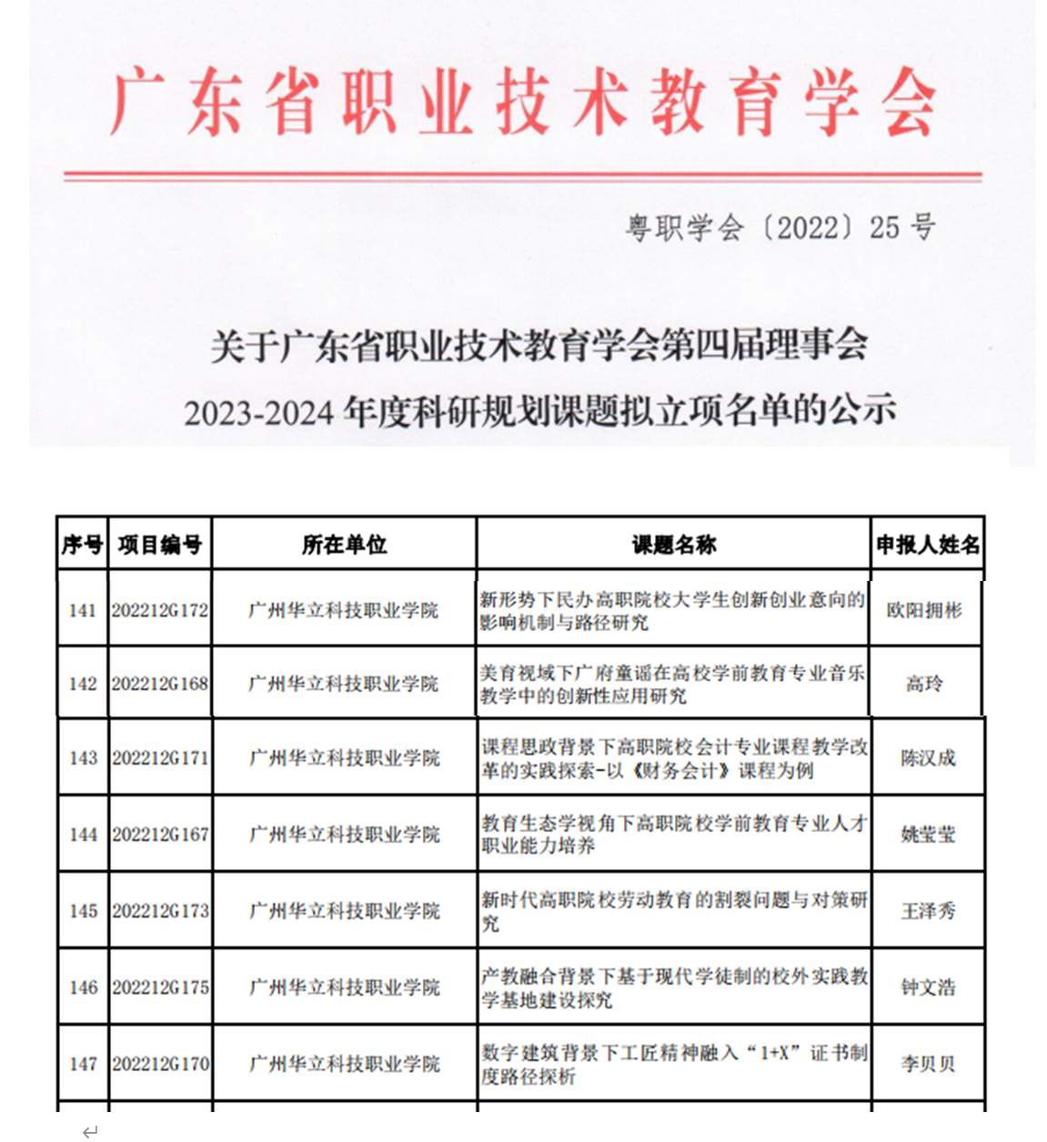 本次我校共申報了廣東省職業(yè)技術(shù)教育學(xué)會2023-2024年度科研規(guī)劃課題9項,通過精心組織、學(xué)校推薦共立項7項,充分體現(xiàn)了我校承擔(dān)省級科研項目的能力和競爭力顯著增強。近年來,學(xué)??蒲刑?/span>加大對縱向科研項目申報的組織指導(dǎo)和項目管理,不斷提升教師創(chuàng)新能力和科研水平。2023年學(xué)校將依托省級科研課題,爭取更多標(biāo)志性成果。