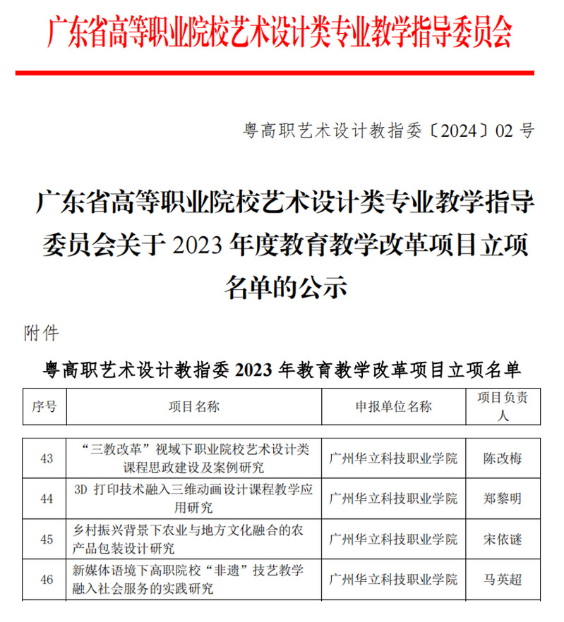 近日,廣東省高等職業(yè)院校藝術(shù)設(shè)計(jì)類專業(yè)教學(xué)指導(dǎo)委員會(huì)公布了2023年度教育教學(xué)改革項(xiàng)目立項(xiàng)結(jié)果。藝傳學(xué)院陳改梅、鄭黎明、宋依謎、馬英超老師的《“三教改革”視域下職業(yè)院校藝術(shù)設(shè)計(jì)類課程思政建設(shè)及案例研究》、《3D打印技術(shù)融入三維動(dòng)畫設(shè)計(jì)課程教學(xué)應(yīng)用研究》、《鄉(xiāng)村振興背景下農(nóng)業(yè)與地方文化融合的農(nóng)產(chǎn)品包裝設(shè)計(jì)研究》、《新媒體語境下高職院?!胺沁z”技藝教學(xué)融入社會(huì)服務(wù)的實(shí)踐研究》獲得立項(xiàng)。此次教學(xué)改革課題獲得立項(xiàng),是學(xué)校領(lǐng)導(dǎo)重視科研工作及藝傳學(xué)院教師積極參與藝術(shù)設(shè)計(jì)類專業(yè)教學(xué)改革的結(jié)果。