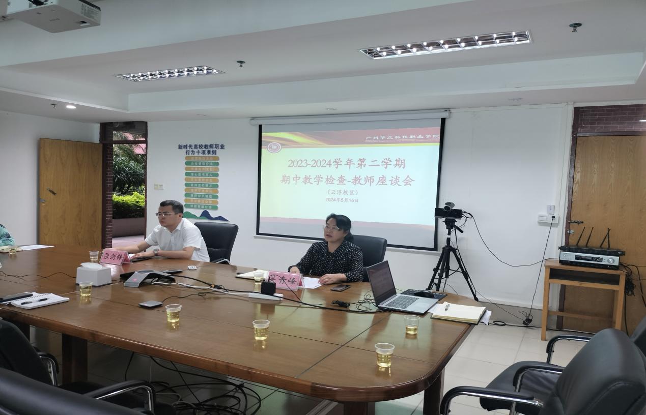 2024年5月16日,我校廣州校區(qū)和云浮校區(qū)分別召開了期中教學(xué)檢查教師座談會(huì)。副校長(zhǎng)陳顯強(qiáng)、校長(zhǎng)助理張劍鋒、教務(wù)處處長(zhǎng)吳青峰、實(shí)訓(xùn)中心主任張磊、教務(wù)處副處長(zhǎng)曾英姿、陳茜及教學(xué)管理人員與各二級(jí)學(xué)院教師代表參加座談會(huì)。其中廣州校區(qū)教師座談會(huì)由曾英姿副處長(zhǎng)主持,在廣州校區(qū)圖書館104舉行;云浮校區(qū)由吳青峰處長(zhǎng)主持,在云浮校區(qū)圖書館1樓會(huì)議室舉行。