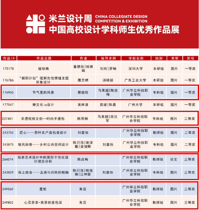 近日,由中國(guó)高等教育學(xué)會(huì)、中國(guó)教育國(guó)際交流協(xié)會(huì)主辦的“第八屆米蘭設(shè)計(jì)周-中國(guó)高校設(shè)計(jì)學(xué)科師生優(yōu)秀作品展”廣東賽區(qū)評(píng)選圓滿落幕。我校藝術(shù)與傳媒學(xué)院師生榮獲一等獎(jiǎng)1項(xiàng),二等獎(jiǎng)3項(xiàng),三等獎(jiǎng)4項(xiàng),(一、二等獎(jiǎng)作品晉級(jí)國(guó)賽)。