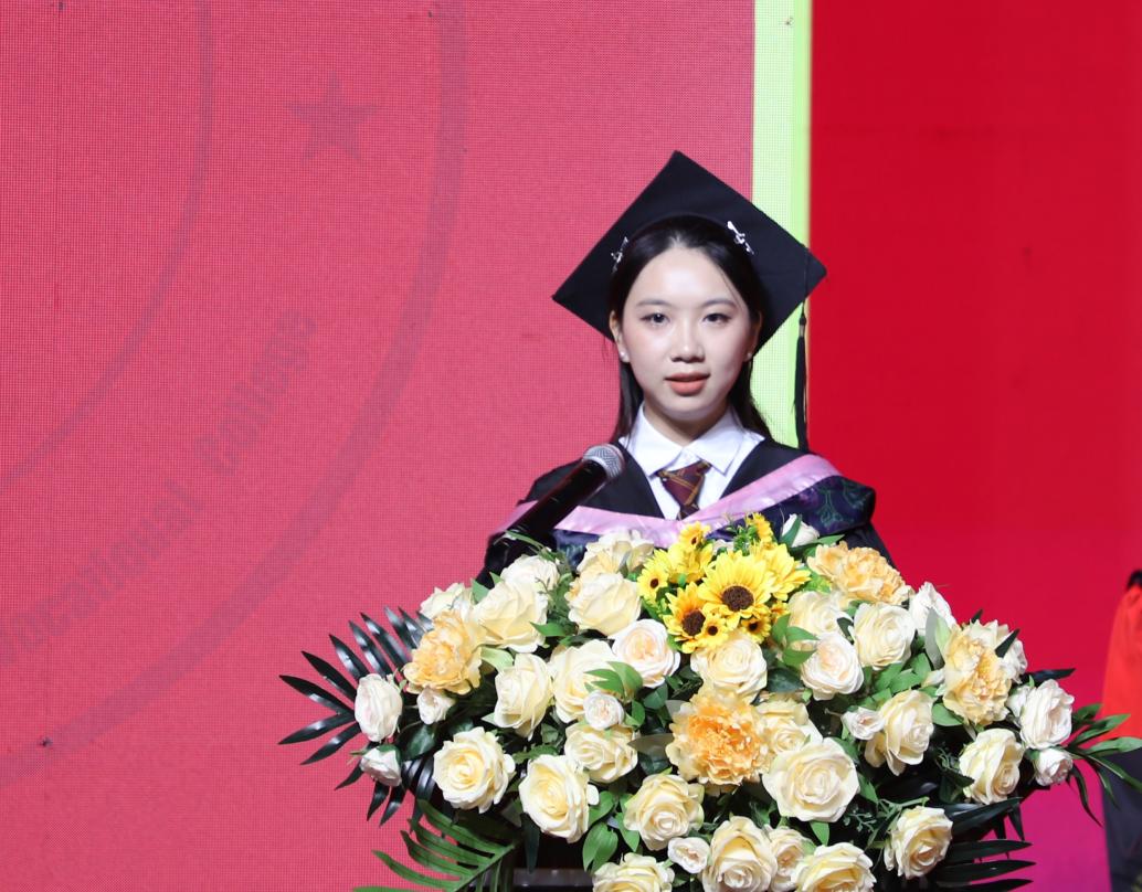 經(jīng)管學(xué)院的黃瑩瑩同學(xué)代表2024屆全體畢業(yè)生進行發(fā)言,對關(guān)切師生的領(lǐng)導(dǎo),和認真教學(xué)、辛勤教課的所有老師們,表示了衷心的感謝和崇高的敬意!表示自己一定會努力成為有理想、有道德、有文化、守紀律的合格畢業(yè)生,給社會、給學(xué)校、給家人交一份滿意的答卷。最后,送上了誠摯的祝福,衷心祝愿母校蓬勃發(fā)展,再譜華章,祝愿老師們碩果累累、桃李滿園,祝愿同學(xué)們一帆風(fēng)順,前程似錦!