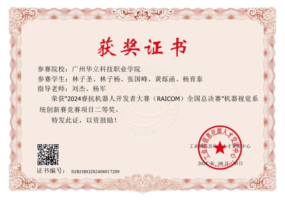 2024年8月20日-22日,2024??箼C(jī)器人開(kāi)發(fā)者大賽全國(guó)總決賽-CAIM機(jī)器視覺(jué)系統(tǒng)創(chuàng)新賽在杭州市余杭區(qū)中國(guó)人工智能小鎮(zhèn)舉行。我院學(xué)生林子圣、林子楊、張國(guó)峰、黃爍函、楊育泰在指導(dǎo)教師劉杰的帶領(lǐng)下,與來(lái)自全國(guó)34個(gè)省市的108支代表隊(duì)、同場(chǎng)地競(jìng)技,角逐一、二、三等獎(jiǎng)。經(jīng)過(guò)緊張激烈的比賽,我院學(xué)生奪得該項(xiàng)目高職組二等獎(jiǎng),可喜可賀。