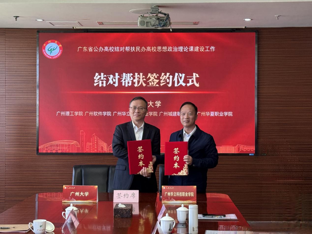 最后,廣州大學(xué)黨委常委、副校長吳開俊與我校陳良聲書記簽約了廣州大學(xué)與廣州華立科技職業(yè)學(xué)院思想政治理論課建設(shè)結(jié)對幫扶協(xié)議。