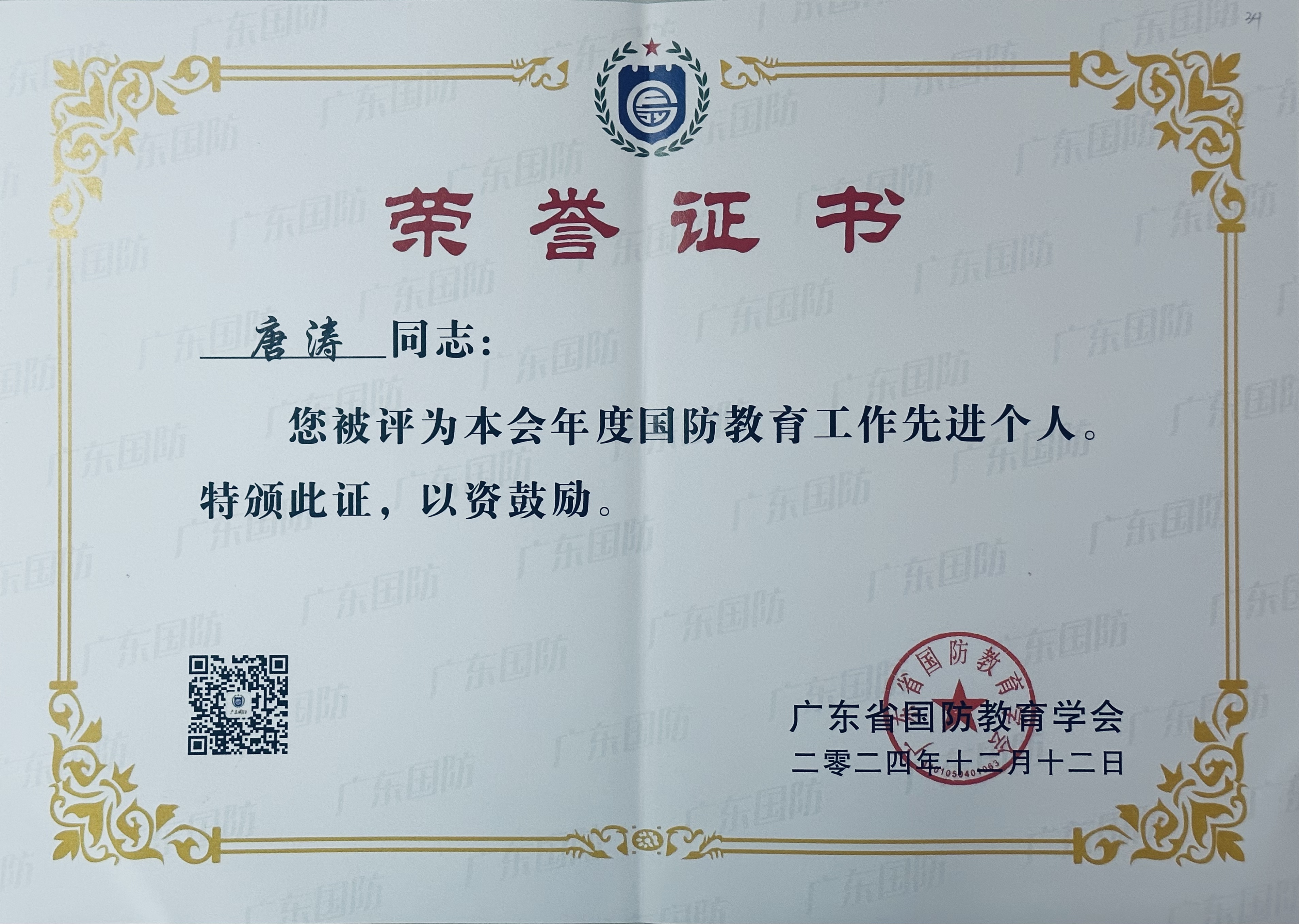 “國防教育先進個人”榮譽證書