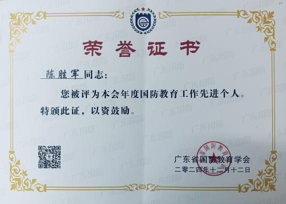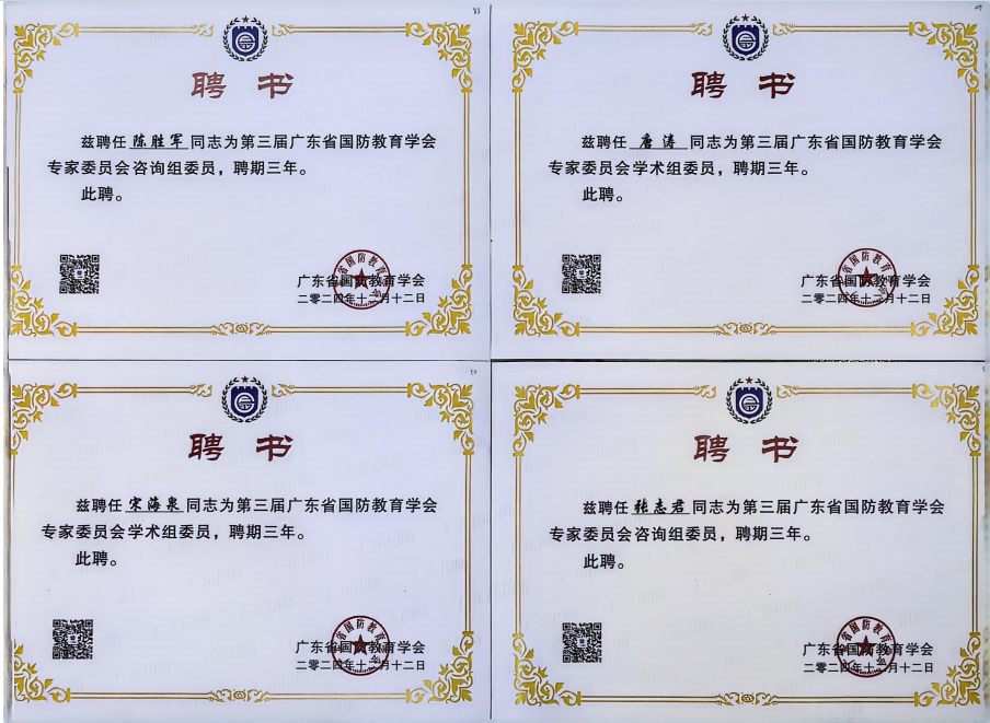 在廣東省國防教育學(xué)會組織的2024年度“國防教育先進評選”活動中,經(jīng)過嚴格評審與綜合考量,廣州華立科技職業(yè)學(xué)院憑借在國防教育領(lǐng)域內(nèi)的卓越貢獻與顯著成效,榮耀地被授予“國防教育先進單位”稱號。同時,我校陳勝軍、張志君、宋海泉、唐濤四位老師被聘為第三屆廣東省國防教育學(xué)會專家委員會成員,陳勝軍、唐濤兩位老師被授予“國防教育先進個人”榮譽稱號。
