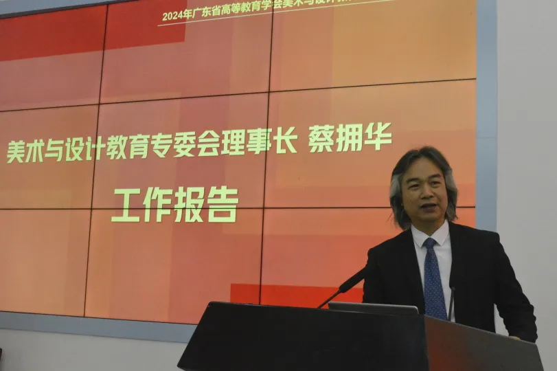 隨后,美術(shù)與設(shè)計(jì)教育專委會(huì)理事長、廣東美術(shù)學(xué)院副校長蔡擁華作了工作報(bào)告。他回顧了過去一年的工作成果,特別提到了習(xí)近平新時(shí)代中國特色社會(huì)主義思想的指導(dǎo)作用,以及十二屆三中全會(huì)的精神指引。蔡擁華強(qiáng)調(diào),新時(shí)代美育教育不僅要在高校內(nèi)部深入貫徹社會(huì)主義核心價(jià)值觀,還要通過各類大賽和實(shí)踐活動(dòng),弘揚(yáng)社會(huì)主義先進(jìn)文化,增強(qiáng)學(xué)生的文化自信。他還介紹了“新時(shí)代新生活新美學(xué)”系列活動(dòng),展示了廣東高校在美育領(lǐng)域的最新成果。