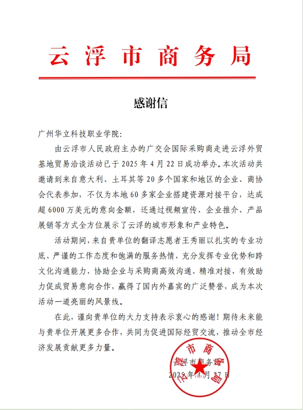 近日,云浮市商務局向廣州華立科技職業(yè)學院發(fā)來感謝信,高度贊揚我校王秀麗教師在由云浮市人民政府主辦的廣交會國際采購商走進云浮外貿基地貿易洽談活動中所提供的翻譯志愿服務工作,并向我校對該活動的大力支持表示衷心感謝!