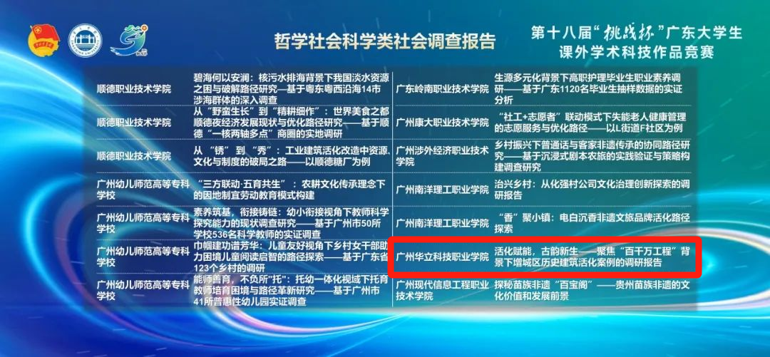 近日,我校藝術(shù)與傳媒學(xué)院劉嘉怡、陳改梅、宋依謎老師共同指導(dǎo)下,由王可欣、梁嘉雯、林燕津等學(xué)生共同完成的《活化賦能,古韻新生——聚焦“百千萬工程”背景下增城區(qū)歷史建筑活化案例的調(diào)研報告》在廣東省第十八屆“挑戰(zhàn)杯”大學(xué)生課外學(xué)術(shù)科技作品競賽決賽中斬獲二等獎,充分展現(xiàn)了我校青年學(xué)子以專業(yè)所學(xué)服務(wù)鄉(xiāng)村振興戰(zhàn)略的責(zé)任擔(dān)當(dāng)與創(chuàng)新實踐。