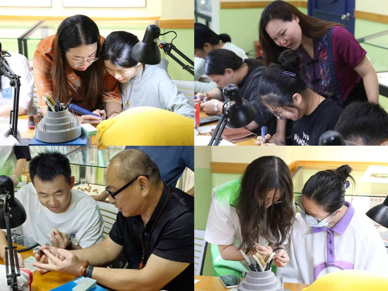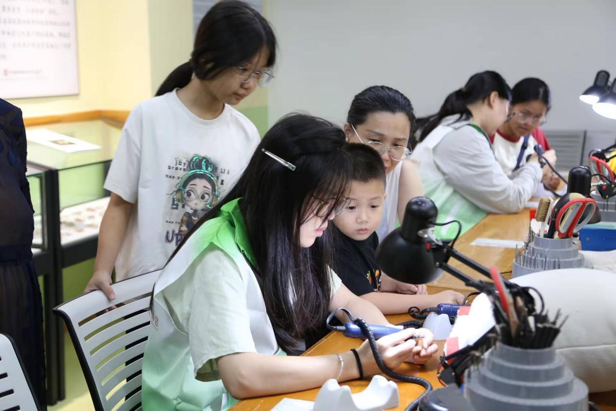 隨后,在師生志愿者的引導(dǎo)下,參觀人員了解認識欖雕原材料,近距離觀摩匠人的雕刻技藝,并細細品味精美的欖雕作品。志愿者生動細致的講解,輔以沉浸式的互動體驗,使大家逐步領(lǐng)略到這項傳統(tǒng)技藝的藝術(shù)精髓與文化底蘊。