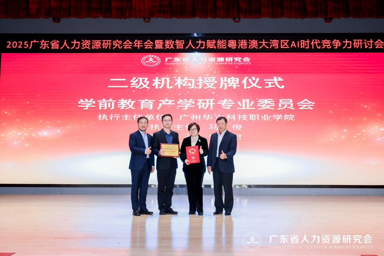 12月6日,2025年廣東省人力資源研究會年會暨數(shù)智人力賦能粵港澳大灣區(qū)AI時代競爭力研討會在廣州天河召開,廣州華立科技職業(yè)學院常務副校長馬俊、藝術(shù)與傳媒學院院長朱君、培訓學院副院長林志受邀參會,學校憑借在產(chǎn)教融合與人才培養(yǎng)領(lǐng)域的突出成果,榮獲2025年度人力資源“創(chuàng)新實踐獎”。