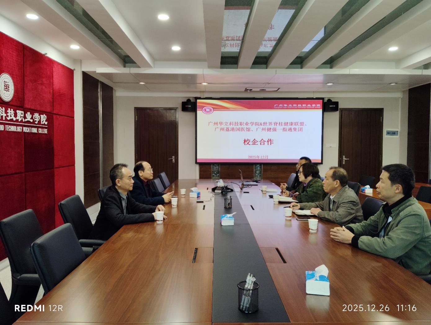 2025年12月26日,世界脊柱健康聯(lián)盟常務副主席、荔港國醫(yī)館館長、健強一指通集團董事長、一指通脊柱推拿療法創(chuàng)始人袁建強先生和世界脊柱健康聯(lián)盟首屆脊柱健康產(chǎn)業(yè)博覽會籌委會顧問陳國偉先生到訪我校,我校常務副校長馬俊、黨委副書記高堯來、中醫(yī)藥學院院長王暉和潘菽弢博士接待了袁館長一行。