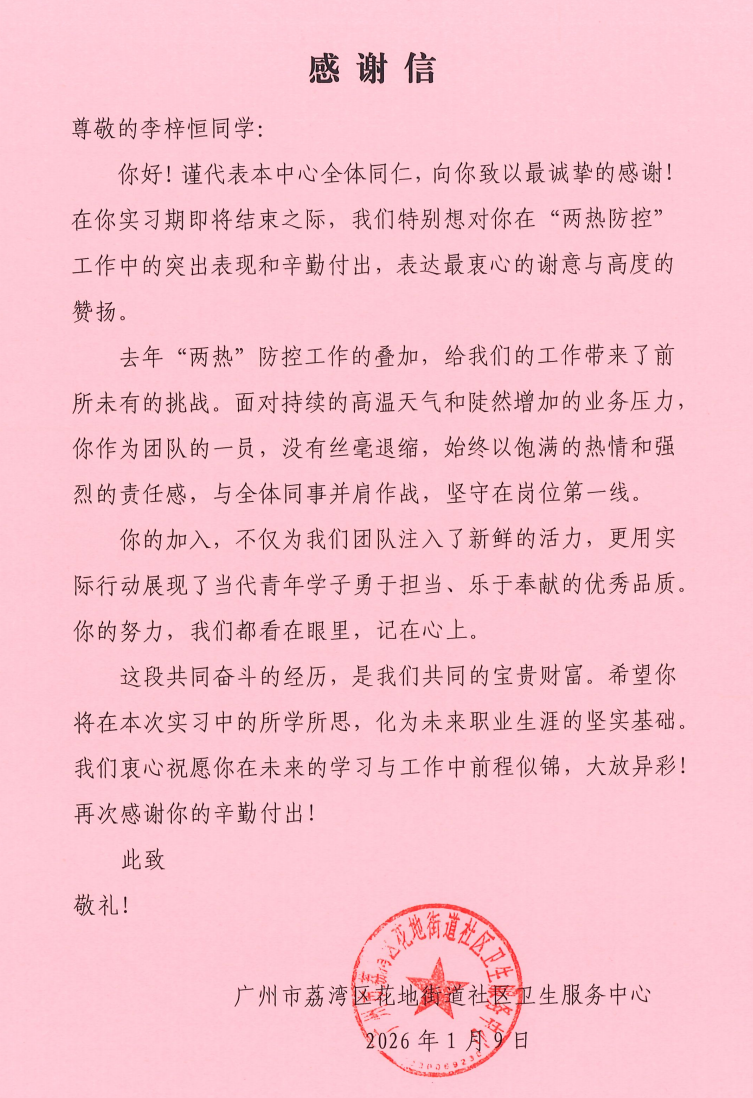 近日,廣州市荔灣區(qū)花地街道社區(qū)衛(wèi)生服務中心正式向我校中醫(yī)藥學院發(fā)來三封感謝信,對 2023 級實習生李淑冰(23 中醫(yī) 17 班)、凌桂華(23 中醫(yī) 17 班)、李梓恒(23 藥學 6 班)在基層實習期間的優(yōu)異表現(xiàn)給予高度評價與特別表揚,充分肯定了三位學子的職業(yè)素養(yǎng)與實踐能力。