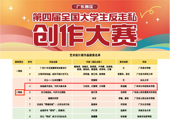 近日,由全國反走私綜合治理調(diào)查研究中心、廣東省打私辦、共青團(tuán)廣東省委員會、廣東省學(xué)生聯(lián)合會主辦的第四屆全國大學(xué)生反走私創(chuàng)作大賽評選結(jié)果正式公布。我校藝傳學(xué)院推薦參賽的兩件海報設(shè)計類作品均榮獲國家級優(yōu)秀作品獎。其中,作品《拒絕象牙走私,守護(hù)大象未來》同時榮獲廣東省賽區(qū)二等獎,指導(dǎo)教師陳浩鵬老師被評為廣東賽區(qū)“優(yōu)秀指導(dǎo)老師”。