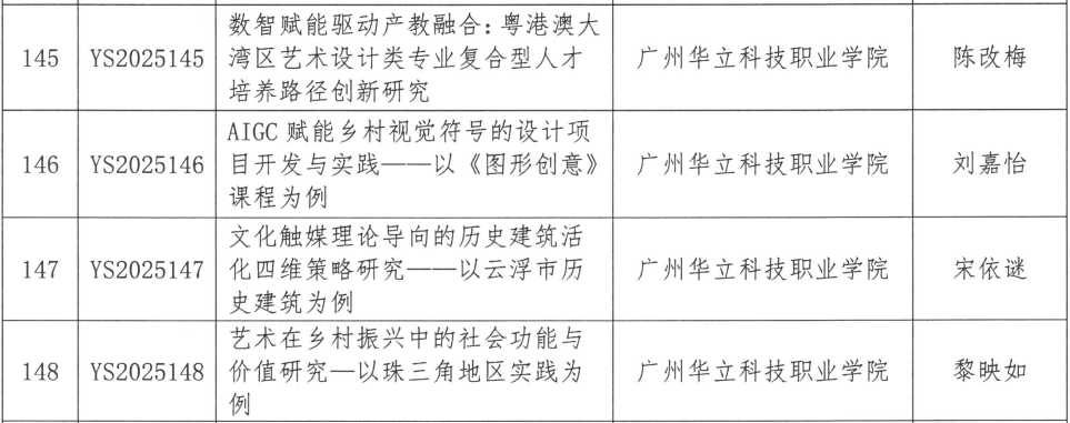 近日,廣東省職業(yè)學(xué)校藝術(shù)設(shè)計(jì)類專業(yè)教學(xué)指導(dǎo)委員會(huì)公布了2025年教育教學(xué)改革研究與實(shí)踐項(xiàng)目立項(xiàng)名單。我校藝術(shù)與傳媒學(xué)院在此次評(píng)審中取得優(yōu)異成績(jī),共有4位教師團(tuán)隊(duì)申報(bào)的項(xiàng)目獲得立項(xiàng)。