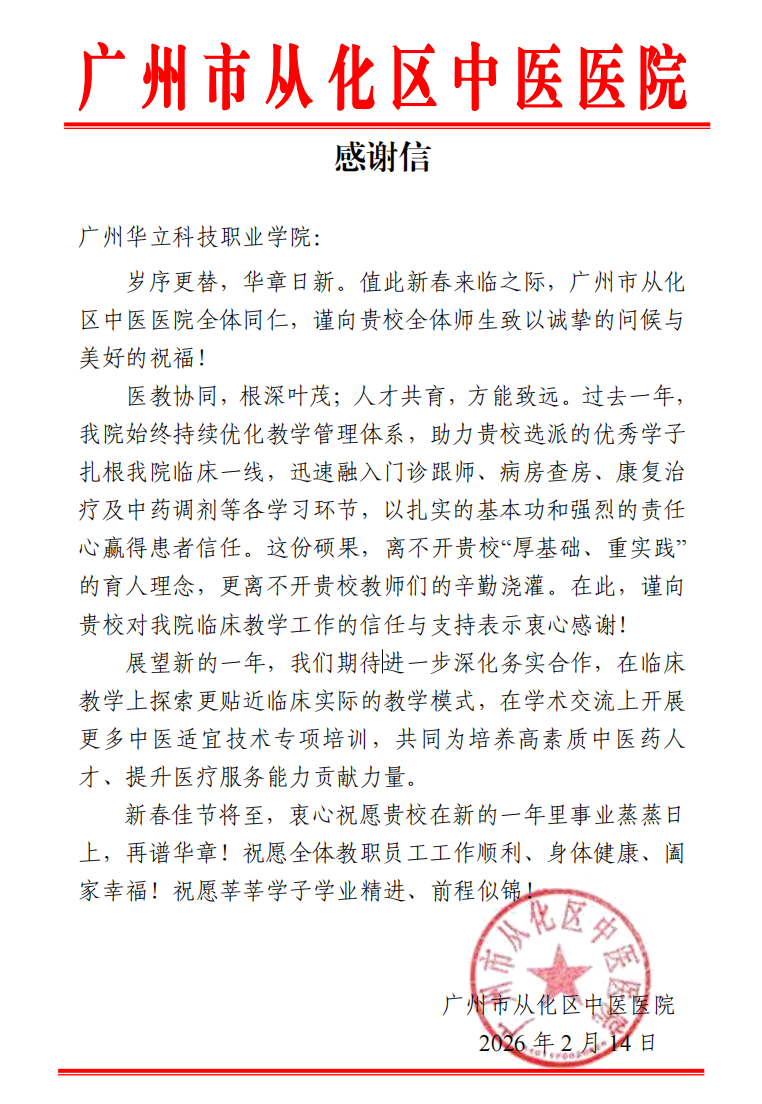 近日,我院收到來自廣州市從化區(qū)中醫(yī)醫(yī)院的一封真摯的感謝信。信中,醫(yī)院對我院選派的中醫(yī)藥學子在臨床實習中的優(yōu)異表現(xiàn)給予充分肯定,并對學院在人才培養(yǎng)方面的扎實工作表示衷心感謝。這份來自臨床一線的認可,是我院堅持“醫(yī)教協(xié)同、德術(shù)并修”育人理念的又一有力見證。