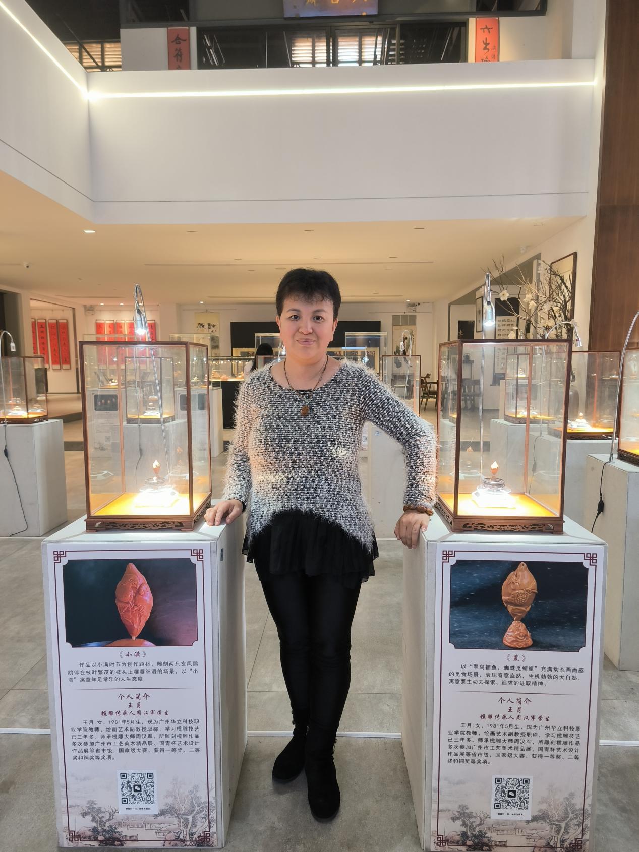 機緣巧合2022年10月隨欖雕大師周漢軍學(xué)習(xí)廣州欖雕,酷愛欖雕的她,平均每天堅持2小時雕欖雕,經(jīng)過3年半的學(xué)習(xí),已經(jīng)掌握了浮雕、圓雕、鏤空雕等技藝。《荔枝》獲得第十九屆廣州市工藝美術(shù)精品展覽工美金工獎銅獎,《和美云浮》獲得“和美云浮”橄欖核雕創(chuàng)作比賽中優(yōu)秀入圍獎,《春筍》榮獲2023年國青杯全國高校藝術(shù)設(shè)計作品展評教師組二等獎,《小滿》榮獲2025年第九屆工美菁英杯銅獎和第八屆粵港澳大灣區(qū)學(xué)校設(shè)計作品展暨第十屆廣東省高校設(shè)計作品學(xué)院獎雙年展工藝組三等獎。