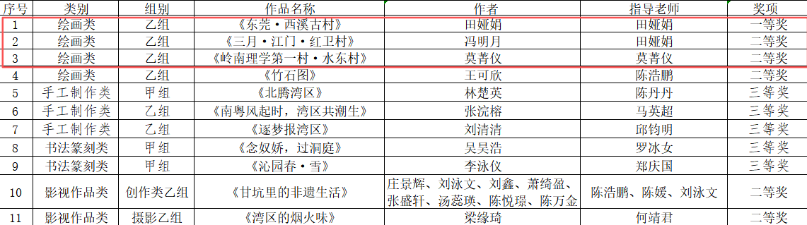 綜上所述,田婭娟老師作品《東莞·西溪古村》榮獲一等獎(jiǎng)、莫菁儀老師作品《嶺南理學(xué)第一村·水東村》榮獲二等獎(jiǎng),田婭娟老師指導(dǎo)馮明月同學(xué)完成的作品《三月·江門(mén)·紅衛(wèi)村》榮獲二等獎(jiǎng),田婭娟、莫菁儀老師分別獲得優(yōu)秀指導(dǎo)教師獎(jiǎng)。