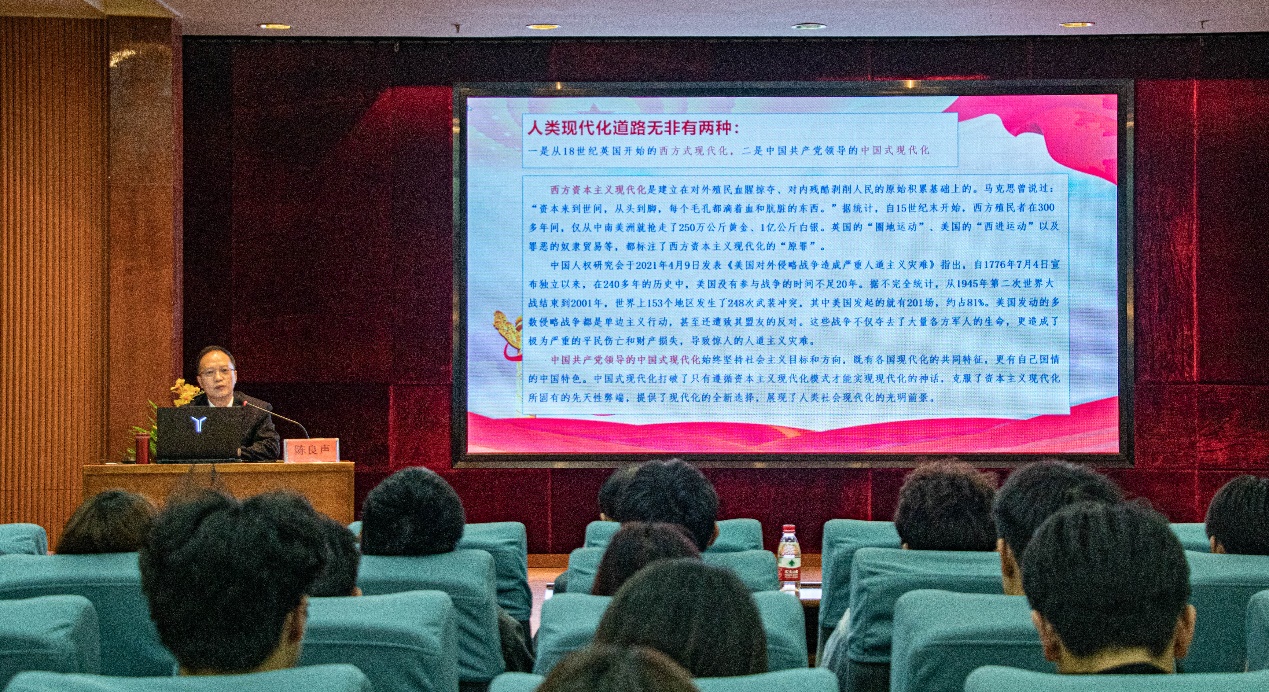 本次授課圍繞“中國(guó)式現(xiàn)代化的探索歷程、中國(guó)式現(xiàn)代化的基本內(nèi)涵、中國(guó)式現(xiàn)代化的本質(zhì)要求、中國(guó)式現(xiàn)代化的戰(zhàn)略支撐、大學(xué)生在新征程勇當(dāng)先鋒”五個(gè)方面展開。陳良聲書記以寬廣深邃的歷史觀,結(jié)合近百年來復(fù)雜的國(guó)際和國(guó)內(nèi)形勢(shì),向同學(xué)們深入解讀了中國(guó)式現(xiàn)代化的發(fā)展歷程、主要特征、豐富內(nèi)涵和戰(zhàn)略支撐,并引用習(xí)近平總書記在與北大師生座談時(shí)發(fā)表的重要講話,勉勵(lì)同學(xué)們?cè)趯?shí)現(xiàn)中國(guó)式現(xiàn)代化新征程上挺膺擔(dān)當(dāng)、勇當(dāng)先鋒。一要愛國(guó),忠于祖國(guó),忠于人民;二要?jiǎng)?lì)志,立鴻鵠志,做奮斗者;三要求真,求真學(xué)問,練真本領(lǐng);四要力行,知行合一,做實(shí)干家。