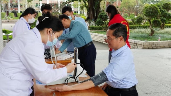 雷毅雄院長帶領同學們?yōu)閹熒鷾y量血壓,并根據(jù)每個人的具體情況給予針對性的健康建議,解答師生們的疑問并及時普及高血壓的危害、預防措施以及日常生活中如何控制血壓等知識。