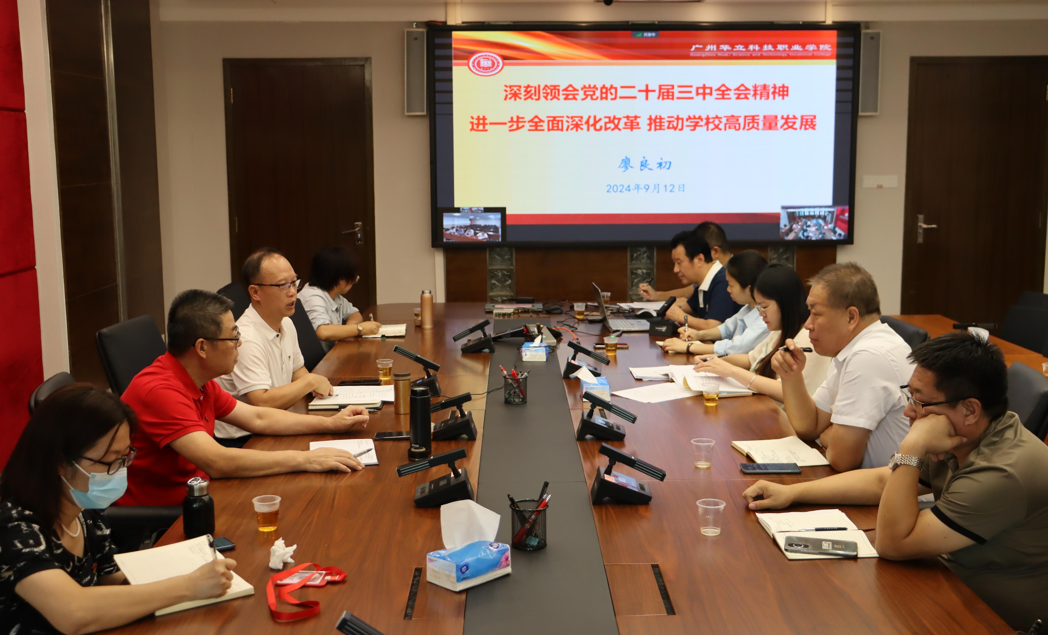 9月12日下午,我校在行政樓305會(huì)議室召開(kāi)黨委理論學(xué)習(xí)中心組(擴(kuò)大)學(xué)習(xí)會(huì)議,馬克思主義學(xué)院院長(zhǎng)廖良初教授作題為《深刻領(lǐng)會(huì)黨的二十屆三中全會(huì)精神,進(jìn)一步全面深化改革,推動(dòng)學(xué)校高質(zhì)量發(fā)展》的專題報(bào)告。黨委書(shū)記陳良聲主持會(huì)議,學(xué)校領(lǐng)導(dǎo)、黨委委員、紀(jì)委委員以及黨委各部門(mén)、各二級(jí)黨組織的負(fù)責(zé)人參加學(xué)習(xí)會(huì),云浮校區(qū)的相關(guān)領(lǐng)導(dǎo)通過(guò)視頻連線參加。
