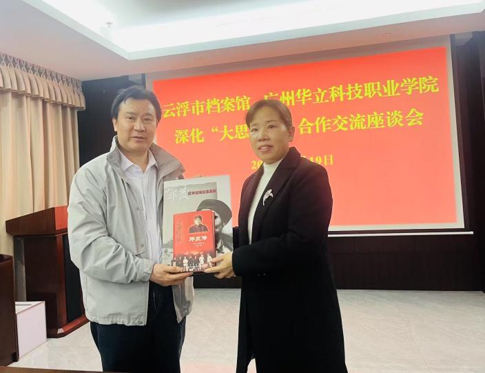 云浮市檔案館副館長彭梅芳表示,云浮市檔案館擁有豐富的紅色文化資源和方志文獻,是開展學校思想政治教育的重要平臺。該館將充分發(fā)揮檔案方志的育人功能,攜手廣州華立科技職業(yè)學院共同推動“大思政課”實踐教學基地的建設與發(fā)展,樂于為青年學生提供更加優(yōu)質(zhì)的研學實踐教育服務。此次座談會在對雙方深化合作、加強交流、館史育人充滿期待的氛圍中結束,雙方還舉行了贈書儀式。
