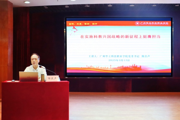 為深入學(xué)習(xí)貫徹黨的二十大和二十屆三中全會(huì)精神,貫徹落實(shí)全省教育大會(huì)精神,2025年3月13日晚,學(xué)校黨委書(shū)記陳良聲在圖書(shū)館一號(hào)報(bào)告廳為藝術(shù)與傳媒學(xué)院300多名師生代表講授題為“在實(shí)施科教興國(guó)戰(zhàn)略的新征程上挺膺擔(dān)當(dāng)”的專(zhuān)題黨課。黨課由藝術(shù)與傳媒學(xué)院黨總支書(shū)記陳改梅主持,學(xué)校辦公室、黨委辦公室、藝術(shù)與傳媒學(xué)院黨員代表參加學(xué)習(xí)。