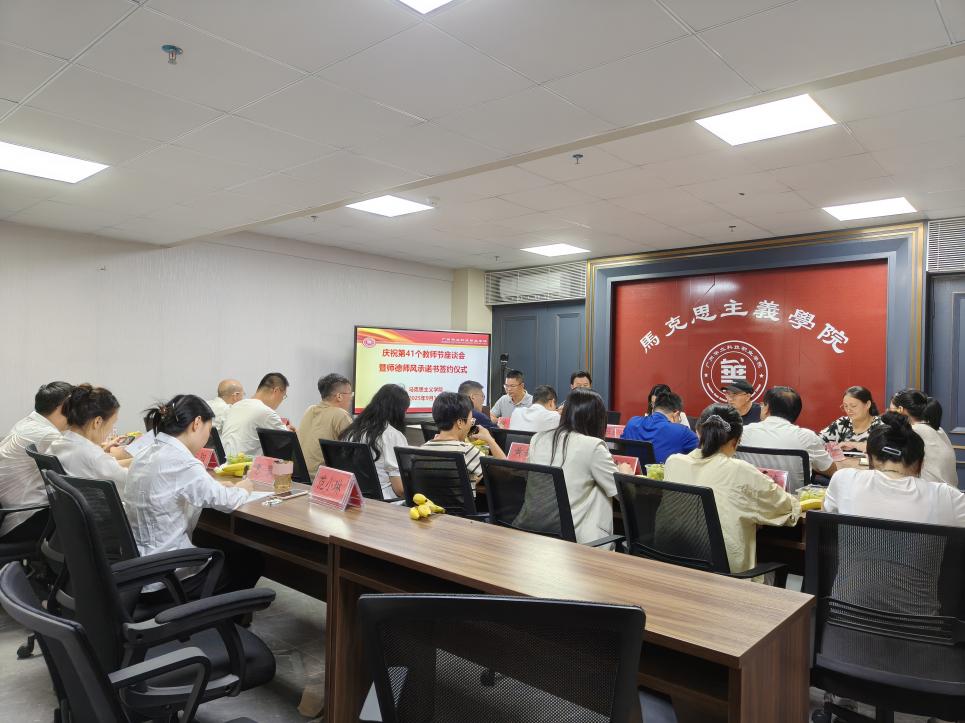 為學(xué)習(xí)弘揚(yáng)教育家精神,培育更優(yōu)良的師德師風(fēng),9月10日下午,馬克思主義學(xué)院在G1-314會(huì)議室舉行了慶祝第41個(gè)教師節(jié)座談會(huì)暨師德師風(fēng)承諾書(shū)簽訂儀式。