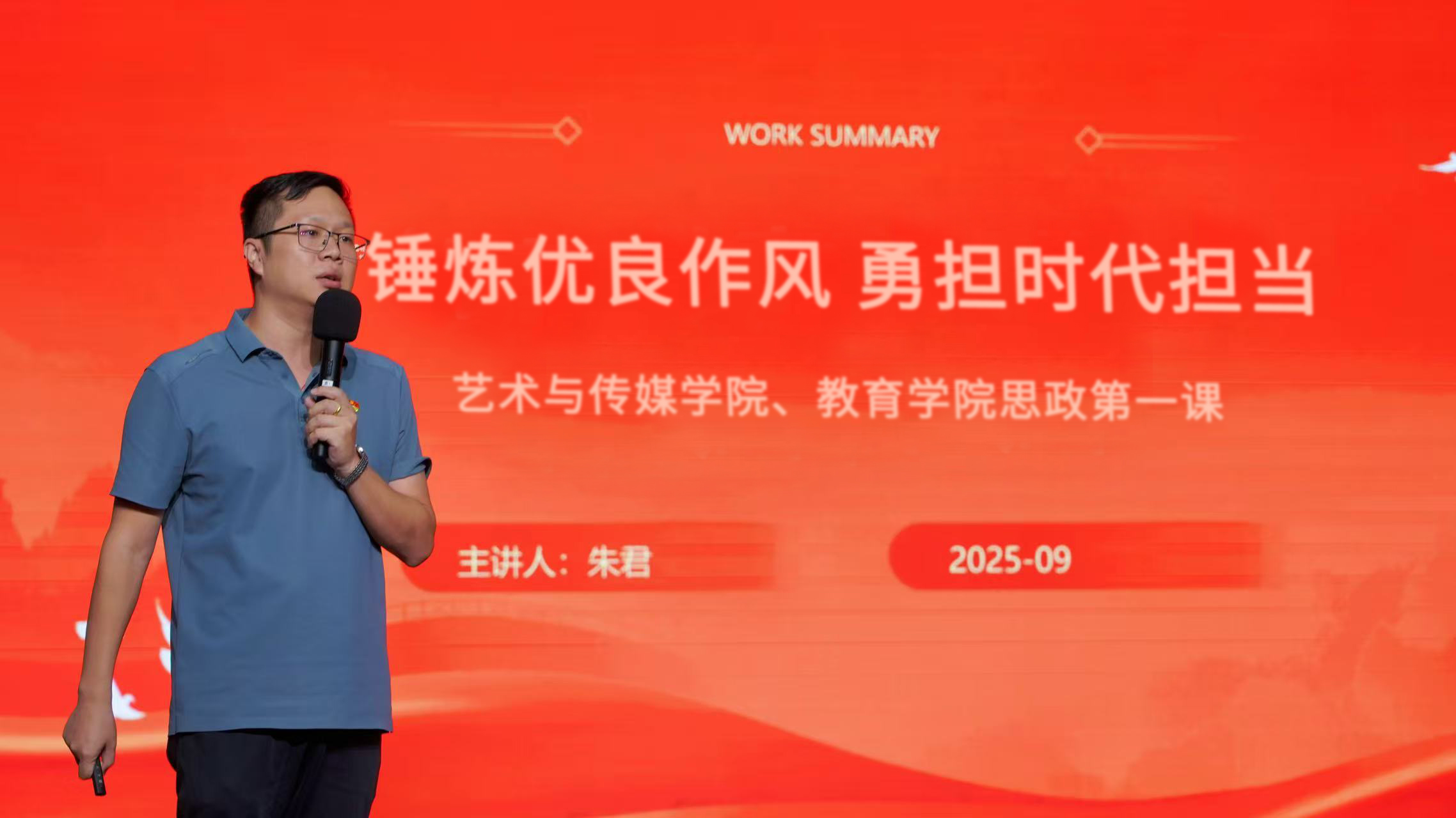 9 月 11 日,藝術(shù)與傳媒學(xué)院院長朱君以“錘煉優(yōu)良作風(fēng) 勇?lián)鷷r代擔(dān)當(dāng)”為主題,在圖書館八樓報告廳開講新學(xué)期“思政第一課”。藝術(shù)與傳媒學(xué)院、教育學(xué)院共計700余名師生代表齊聚現(xiàn)場聽課。