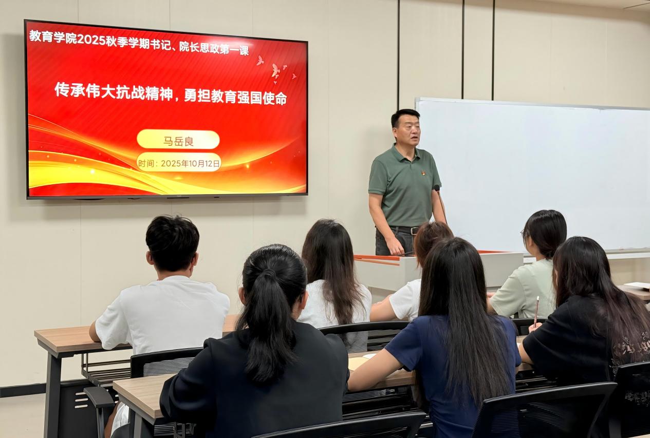 為引導(dǎo)新生厚植家國(guó)情懷、明確時(shí)代使命,10月12日晚,教育學(xué)院黨總支書(shū)記、院長(zhǎng)馬岳良教授,以“傳承偉大抗戰(zhàn)精神,勇?lián)逃龔?qiáng)國(guó)使命”為主題,從“銘記歷史、錘煉作風(fēng)、明確使命”三個(gè)方面,為2025級(jí)學(xué)前教育、體育教育、美術(shù)教育專業(yè)新生們帶來(lái)了一堂兼具思想深度與實(shí)踐指導(dǎo)意義的思政第一課。