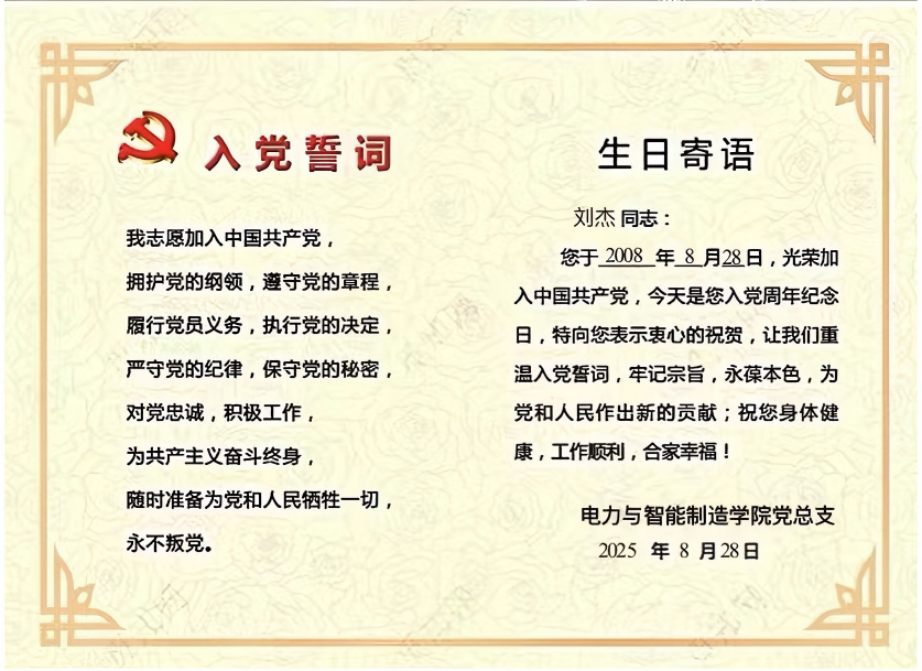 劉杰是電力與智能制造學(xué)院教師黨支部的一名教師黨員,8月28日早上,她收到了學(xué)院黨組織發(fā)來的“政治生日”賀卡。轉(zhuǎn)眼間,加入中國共產(chǎn)黨已經(jīng)17年。