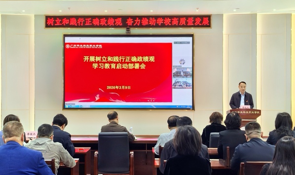 2026年3月9日下午,學(xué)校開展樹立和踐行正確政績觀學(xué)習(xí)教育動員部署會議在圖書館104會議室召開。學(xué)校全體校領(lǐng)導(dǎo)、各職能部門負責(zé)人、各二級學(xué)院黨組織書記和院長參加會議。云浮校區(qū)相關(guān)領(lǐng)導(dǎo)以視頻會議形式參加。會議由廣州華立科技職業(yè)學(xué)院校長、校黨委副書記廖俊杰主持,學(xué)校黨委書記陳良聲作了題為《自覺樹立和踐行正確政績觀 奮力推動學(xué)校高質(zhì)量發(fā)展》的動員講話。